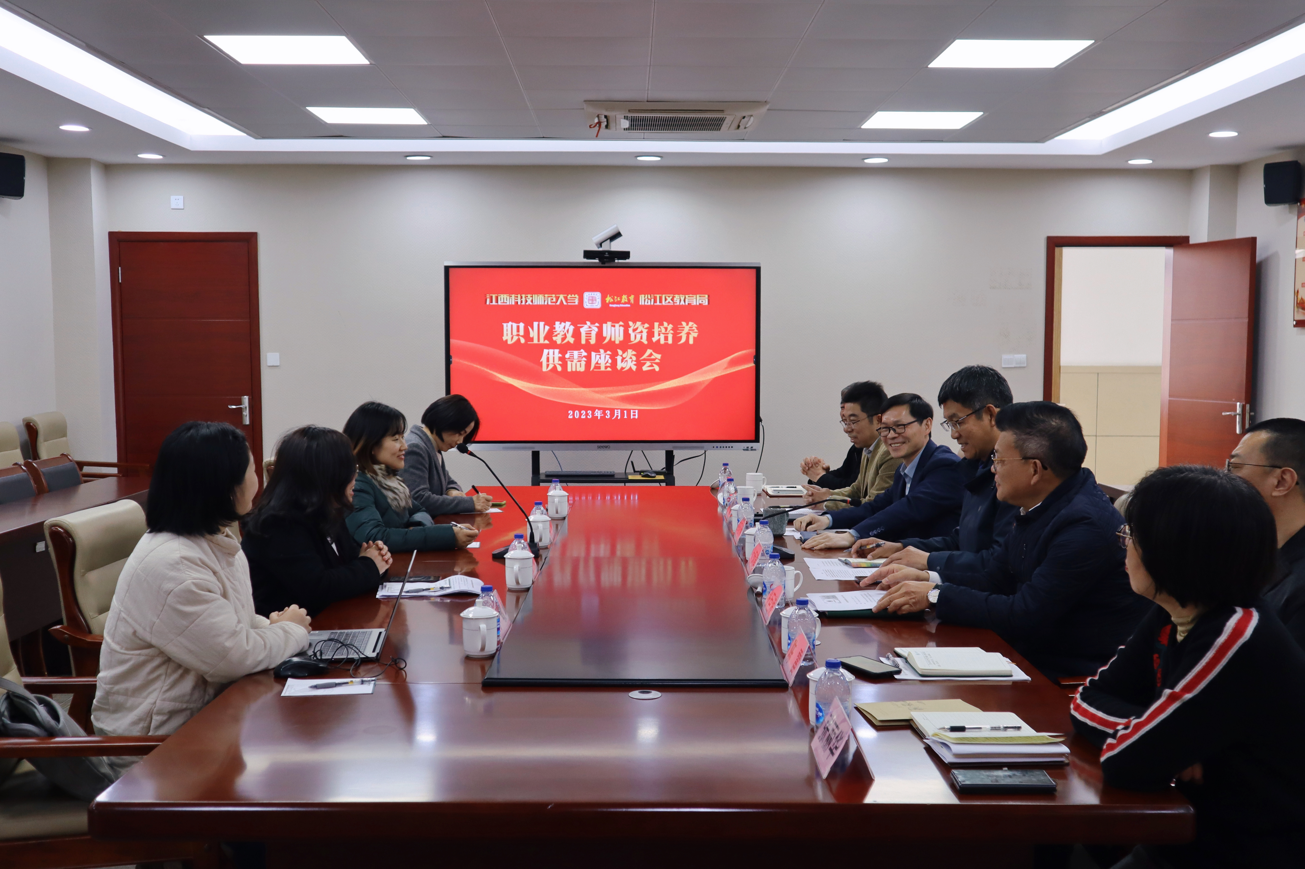 3月1日下午,江西科技师范大学经济管理学院副院长刘斌一行四人来松就职业教育师资培养供需进行调研座谈,座谈会在上海科创职业技术学院举行。区教育局副局长付炳建、职成教科科长张峰、专职干部韩玉婷,上海科创职业技术学院党委书记张巨浪、院长李闽洲,上海市城市科技学校党委书记、校长陈雷,新桥职校校长陈炜、松江职业教育集团办公室主任张丽华等出席座谈会。会议由李闽洲院长主持。