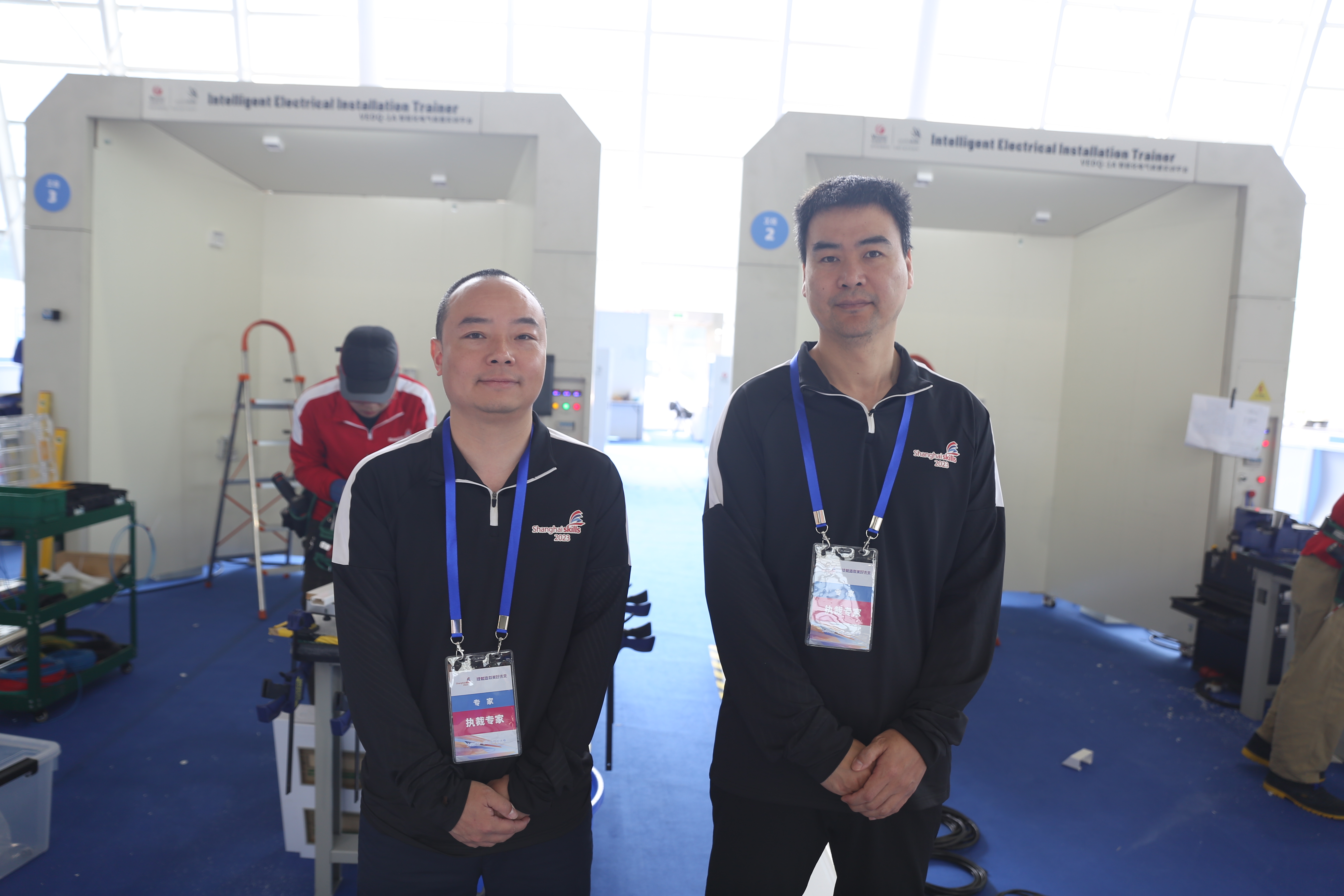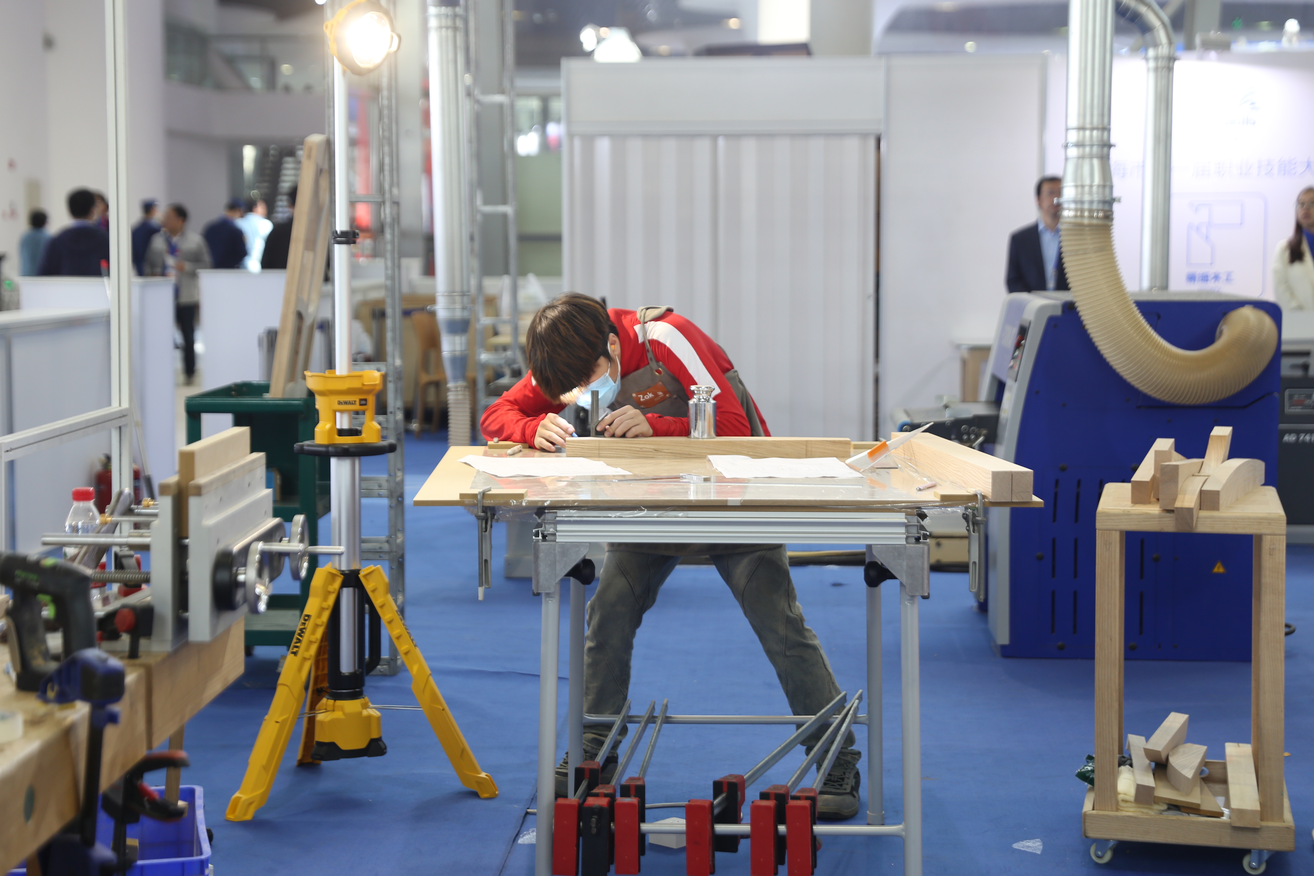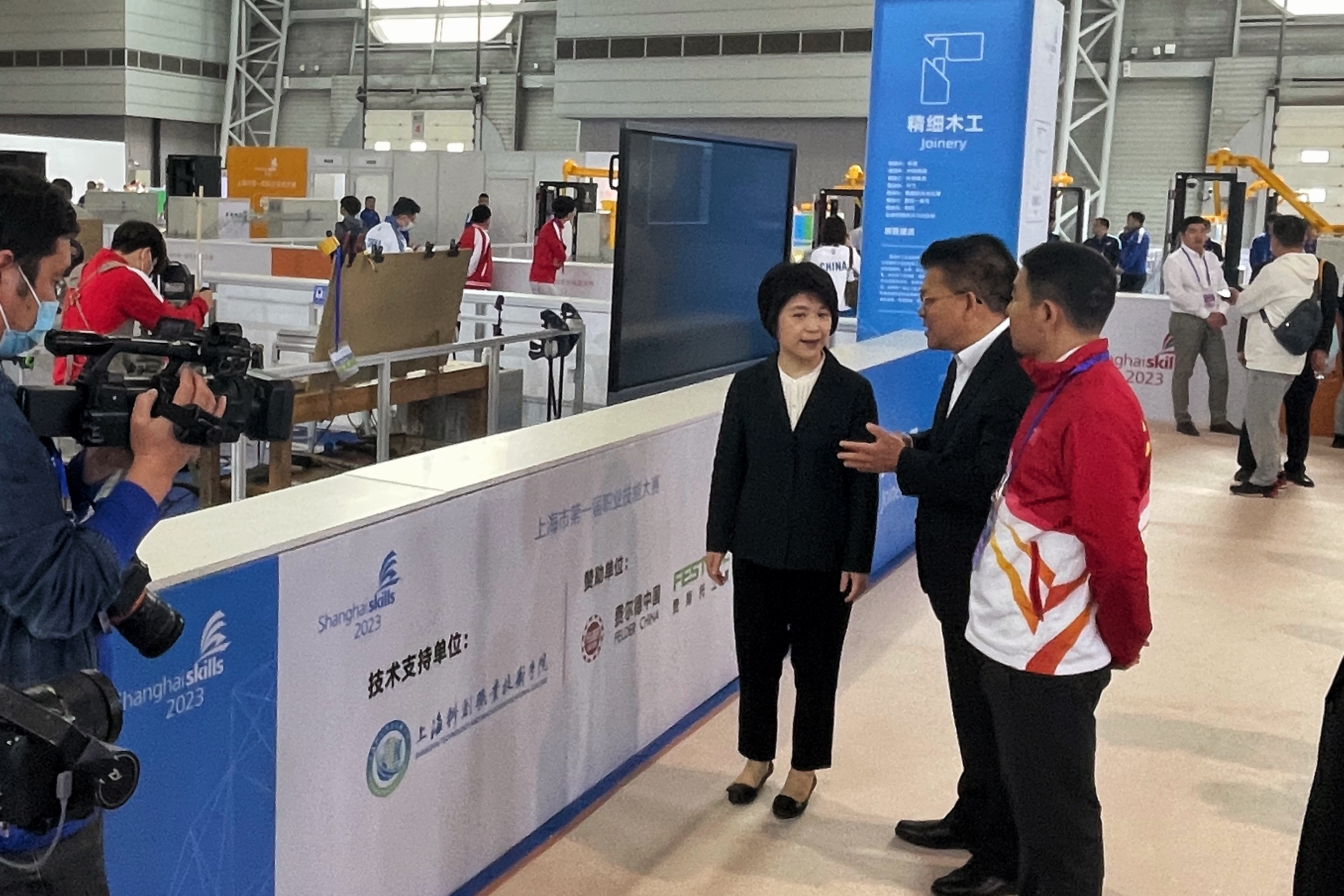 大赛现场,市委常委、副市长郭芳,松江区副区长刘福升在学院党委书记张巨浪等陪同下巡视指导精细木工项目赛场。院长李闽洲、副院长项国平等前往各项目赛场进行指导。