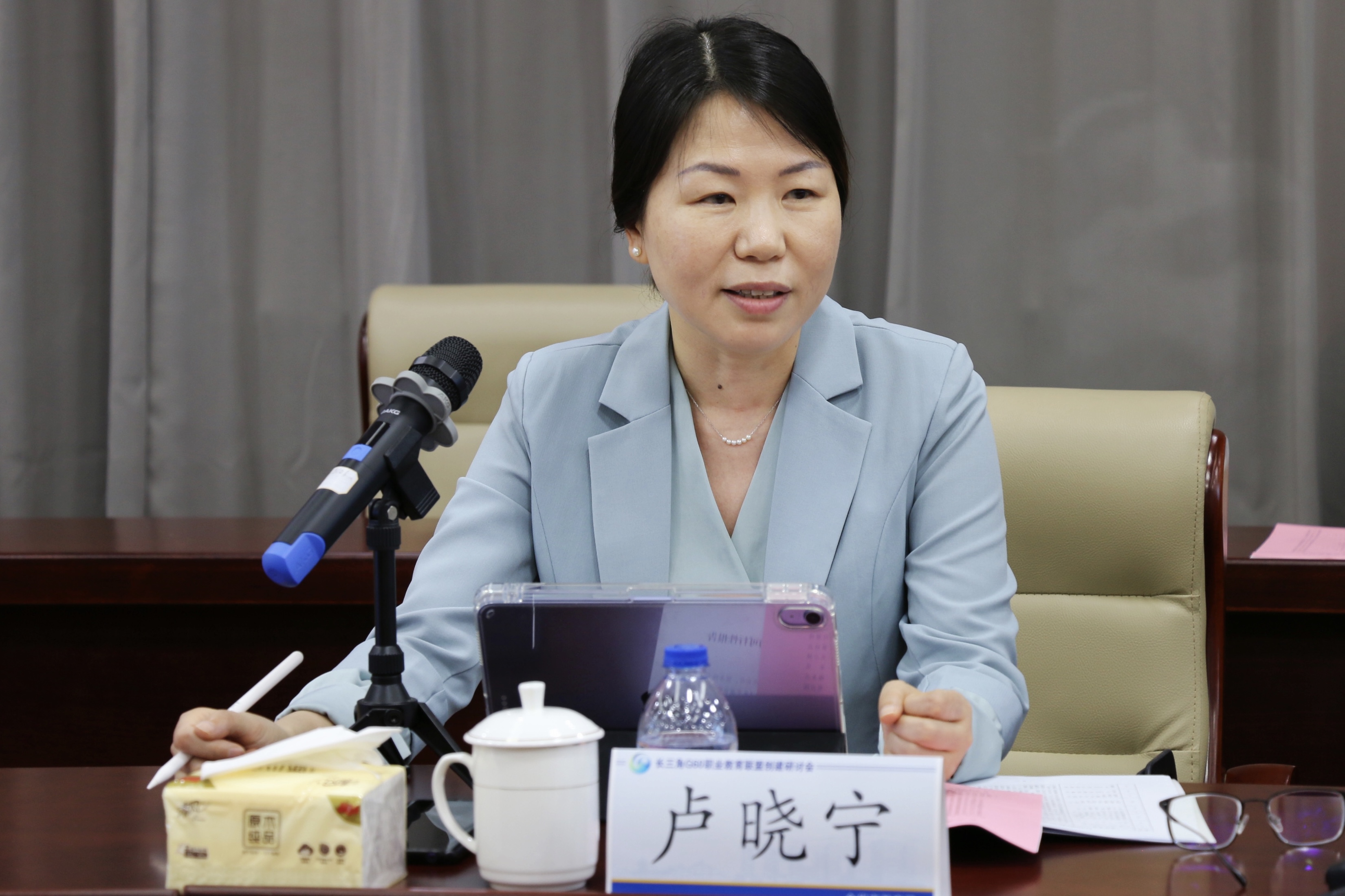 顾洁燕为本次研讨会致辞。她对合肥、芜湖、宣城、湖州、苏州、嘉兴、杭州、金华、六安九城市教育界领导的到来表示热烈欢迎。她强调,在职业教育高质量发展和长三角一体化高质量发展背景下,以产教融合为导向,以人才培养为纽带,以聚集优质职教资源为重点,共商G60职业教育联盟创建工作,精准服务长三角经济社会发展,具有十分重要的意义。她指出,创建长三角G60职业教育联盟,要把握好三个方面:一是科创引领、协同发展,服务国家战略;二是优势互补、互利共赢,服务地方经济;三是加强联动、产教融合,服务人才培养。