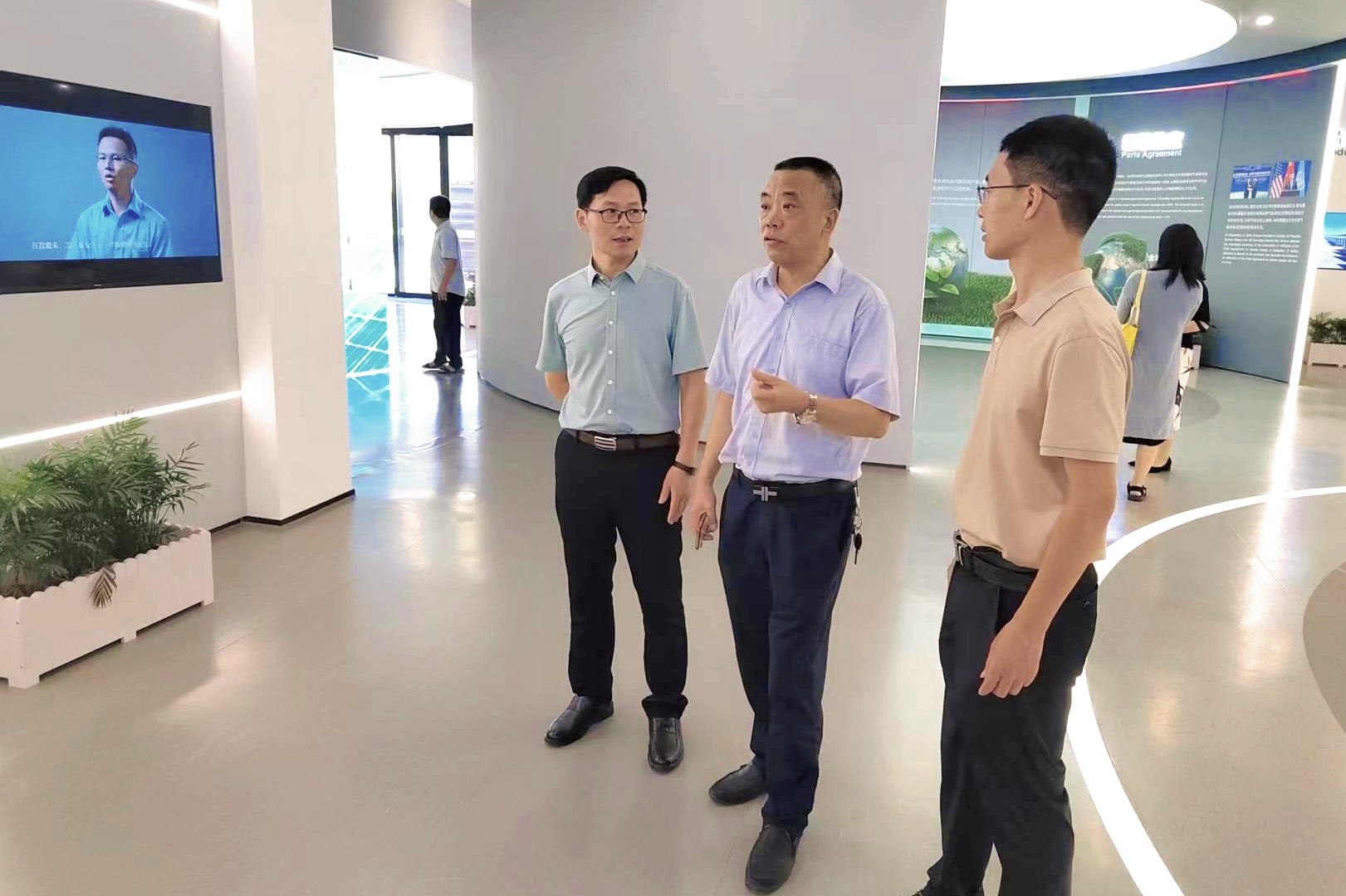 会后,在比亚迪公司相关领导陪同下,李闽洲等人共同参观了比亚迪人力资源部、太阳能面板展示中心、太阳能面板制造车间等。