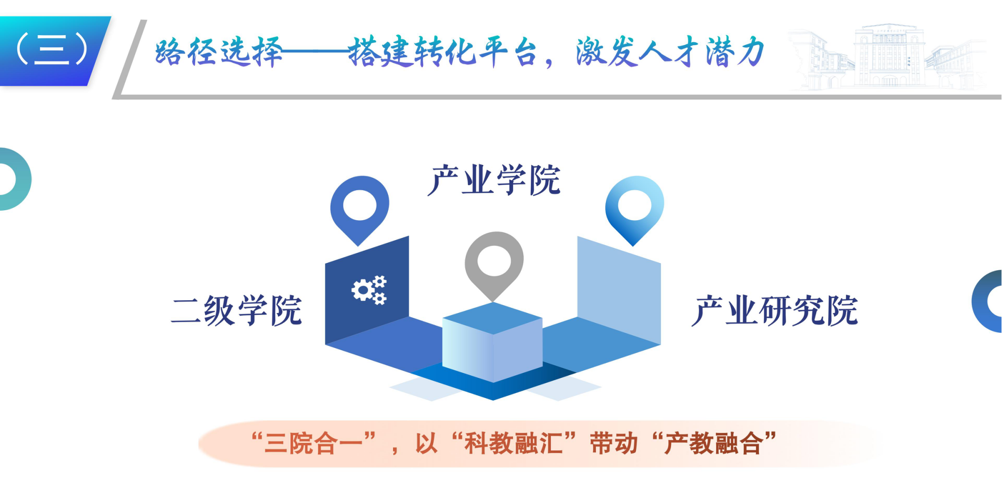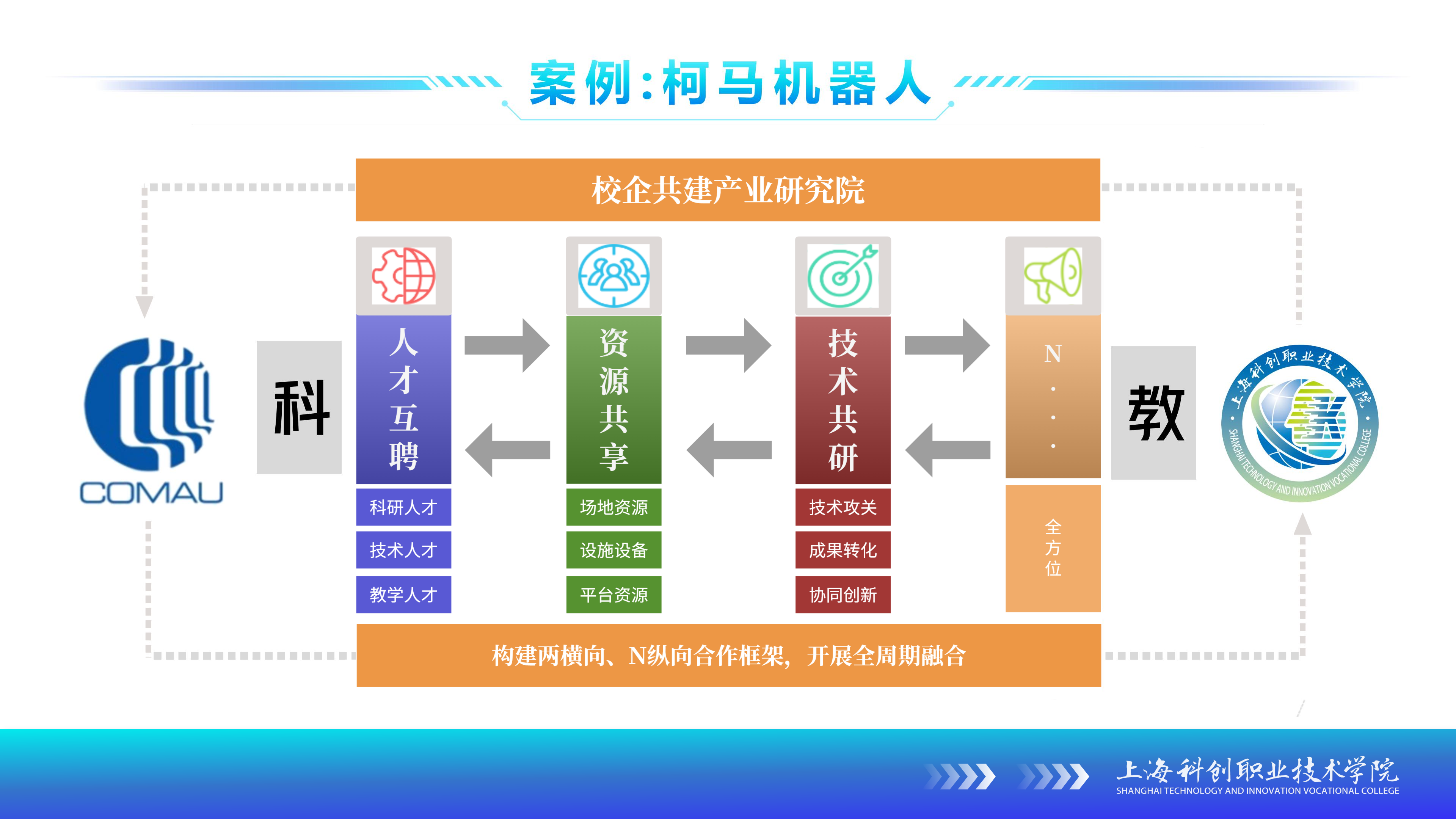 他表示,科教融汇赋予新型高职办学新内涵、新活力和新方向。作为新型高职,学院要完善制度设计,激发融合活力。将从制度设计层面入手,明确相关方权责关系、资源整合与共享关系、利益分配、人事与考核激励等事项。分享了学院将与柯马机器人公司共建产业研究院并在人才互聘、资源共享、技术共研等方面构建“两横向,N纵横”的合作框架,进一步体现学院在产学研贯通过程中与区域产业的研发生产和创新业务进行紧密对接作出的全新尝试。