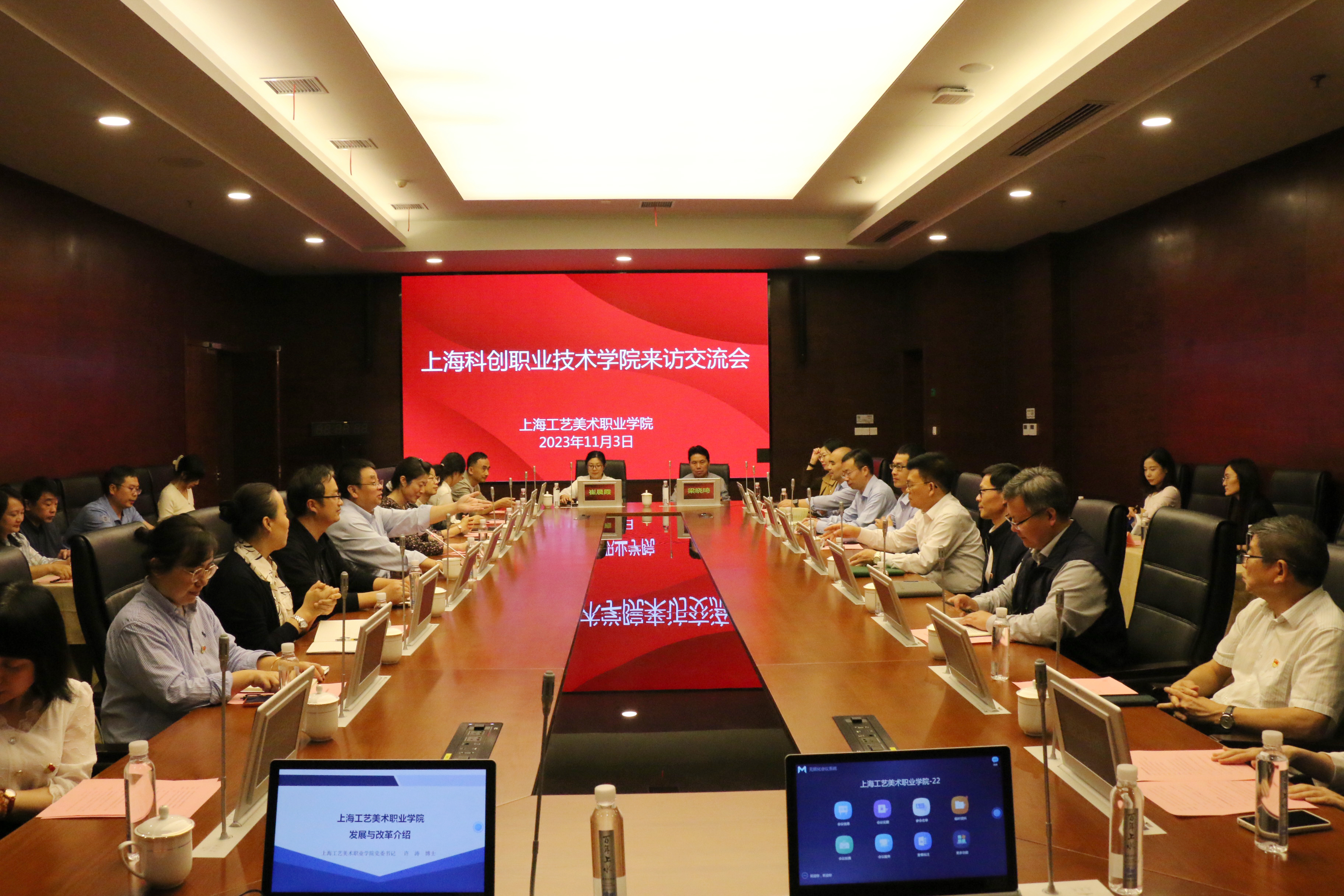 11月3日下午,学院党委书记张巨浪,党委副书记、院长李闽洲等领导班子成员、处级干部,主题教育办公室成员、基层党组织联络员等一行21人赴上海工艺美术职业学院调研学习。上海工艺美术职业学院党委书记许涛,党委副书记、副院长王波和各职能部门、二级学院负责人出席了调研交流会。