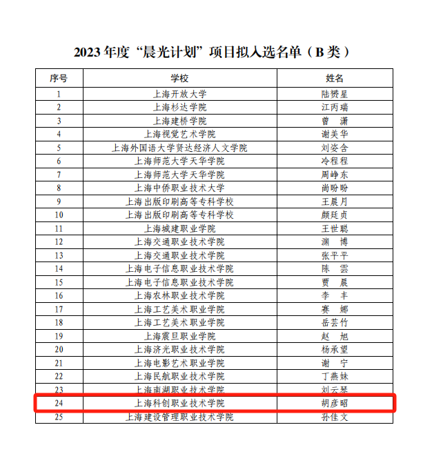 近日,上海市教委公布了2023年度“晨光计划”项目拟入选名单,学院青年教师胡彦昭主持的课题成功入选,这也是学院成立以来首次申报上海市“晨光计划”项目并成功获得立项的课题。
