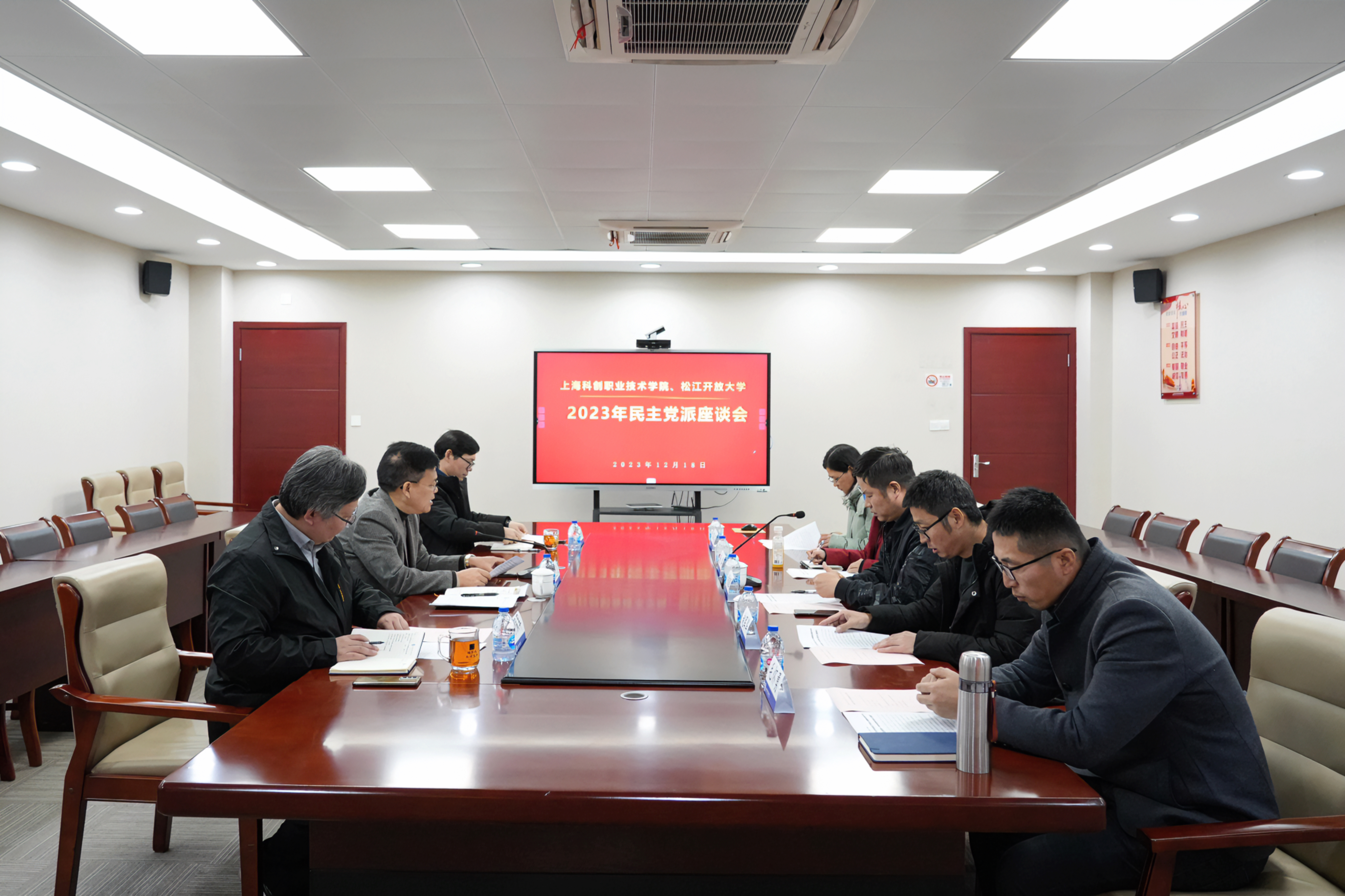 2023年12月18日下午,上海科创职业技术学院、松江开放大学2023年民主党派人士座谈会在5403会议室召开。学院党委书记张巨浪主持会议并作讲话,学院党委副书记、院长李闽洲,松江区政协常委、民进松江区委副主委、副院长何佩军,民进、民盟、民革、致公党等民主党派代表和相关部门负责人参加座谈会。