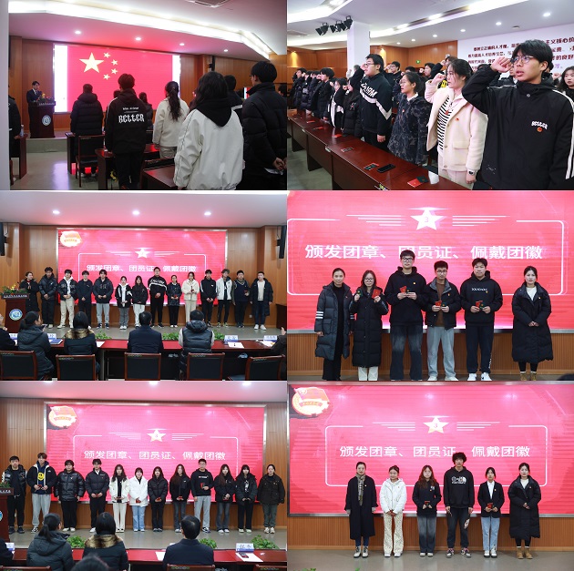 仪式在嘹亮的国歌声中拉开帷幕,随后学工部方莉老师宣布新团员名单。成为共青团的一员,是对这30位科创学子品德和能力的认可,更是责任和担当的期望。各二级学院负责人、团委老师为新团员颁发团章、团员证、并佩戴团徽。红色的团章,富有深刻的内涵,小小的团员证有着沉甸甸的分量,胸前的团徽仿佛在激励青年去勇敢的发光。戴上团章的新团员们,面对鲜艳的团旗,以最宏亮的声音,举起右手,庄严宣誓,他们将用青春践行这一份承诺。