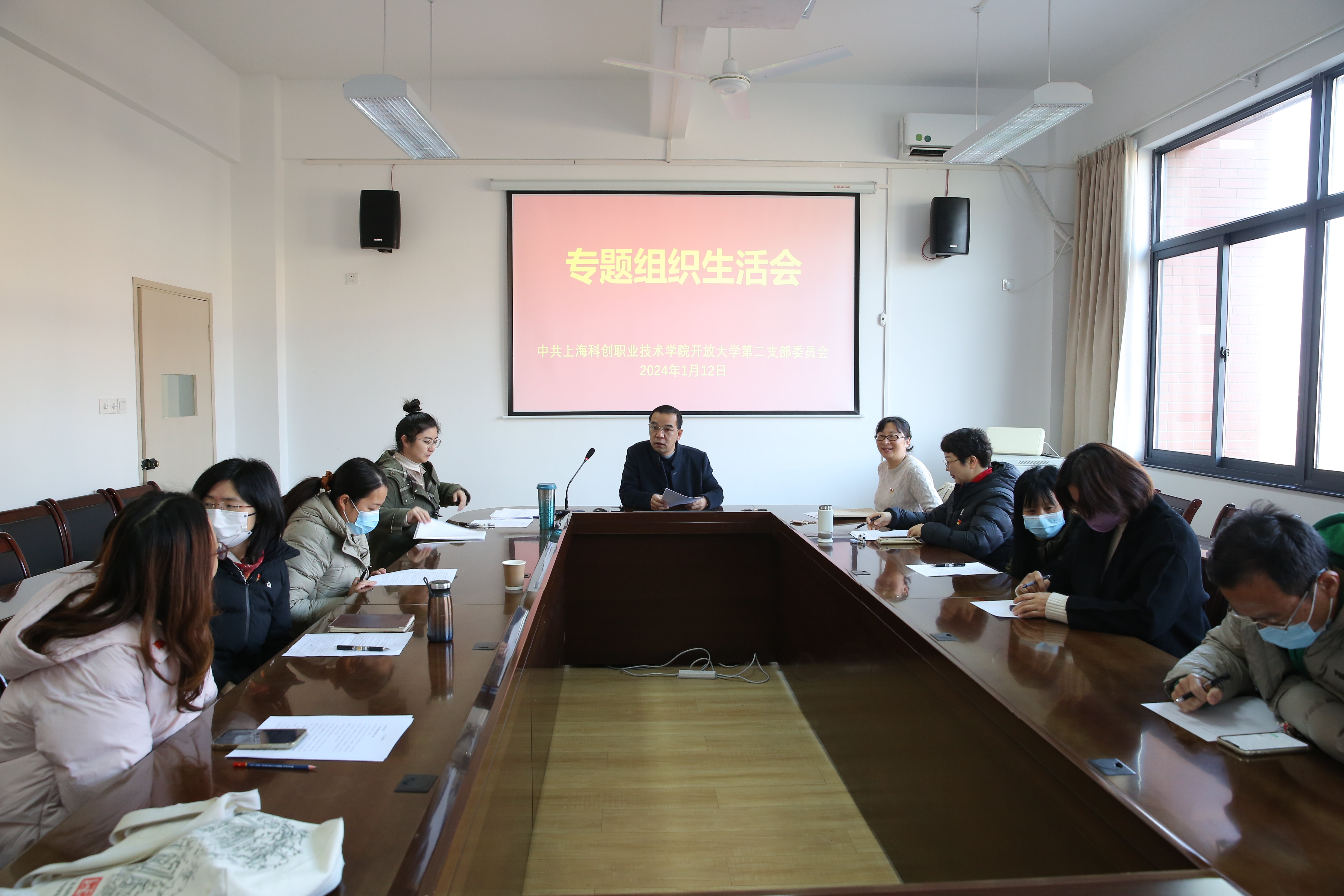 2024年1月12日上午中共上海科创职业技术学院开放大学第二党支部在滨悦路校区召开专题组织生活会,本次会议由王学斌同志主持,第二支部全体党员参加。会议涵盖了党员联系实际查摆问题、开展批评和自我批评、民主测评等环节。