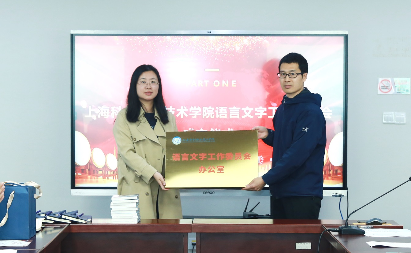 在科创职院语委成立仪式上,李志伟宣读了语委成员名单,并为语委办授牌。