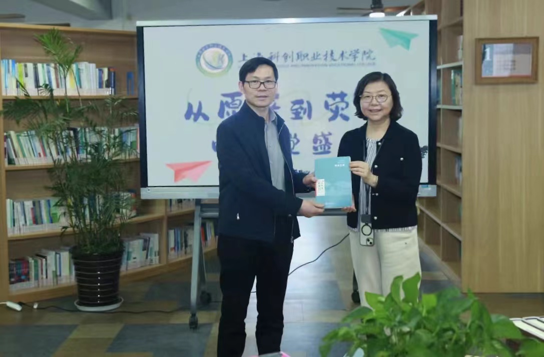 随后,李闽洲赠送了名为《海派文化图鉴——锦绣云间》的书给郑老师,以表达感谢。李闽洲在讲话中指出:希望全校师生以书为友,以书润心,保持好奇心和求知欲,积极投入到阅读的海洋中。他希望师生们在读书前带着问题,读书时带入思考,读书后带出笔墨,通过全员乐读、善读、活读,共筑书香科创的阅读品牌。