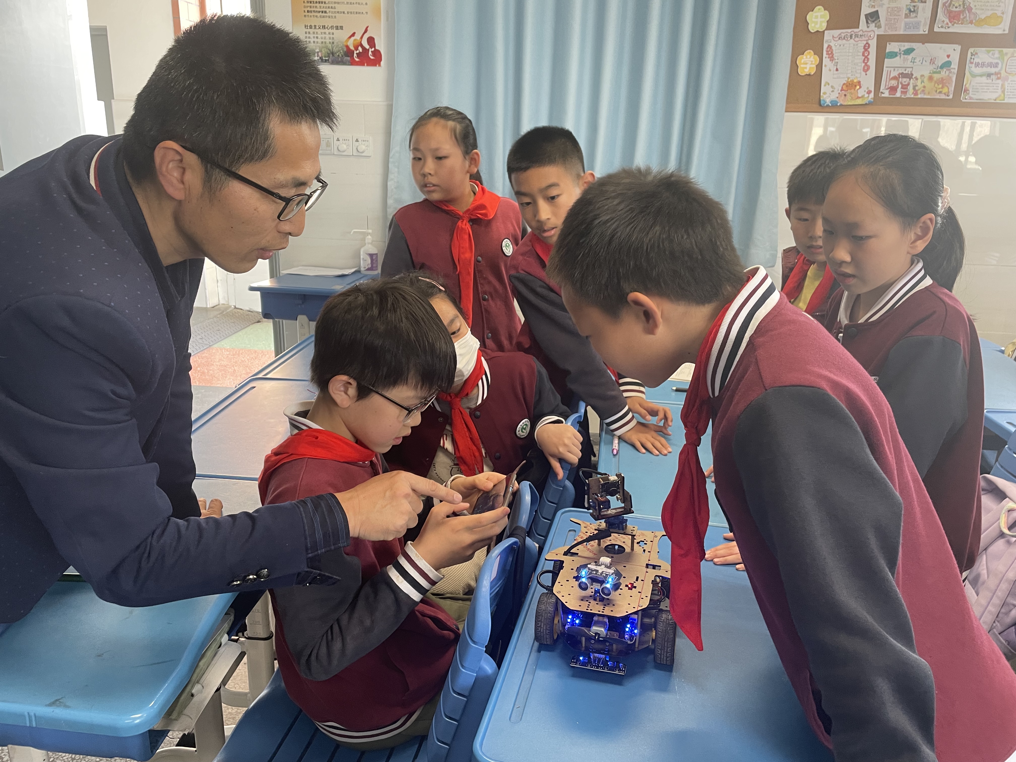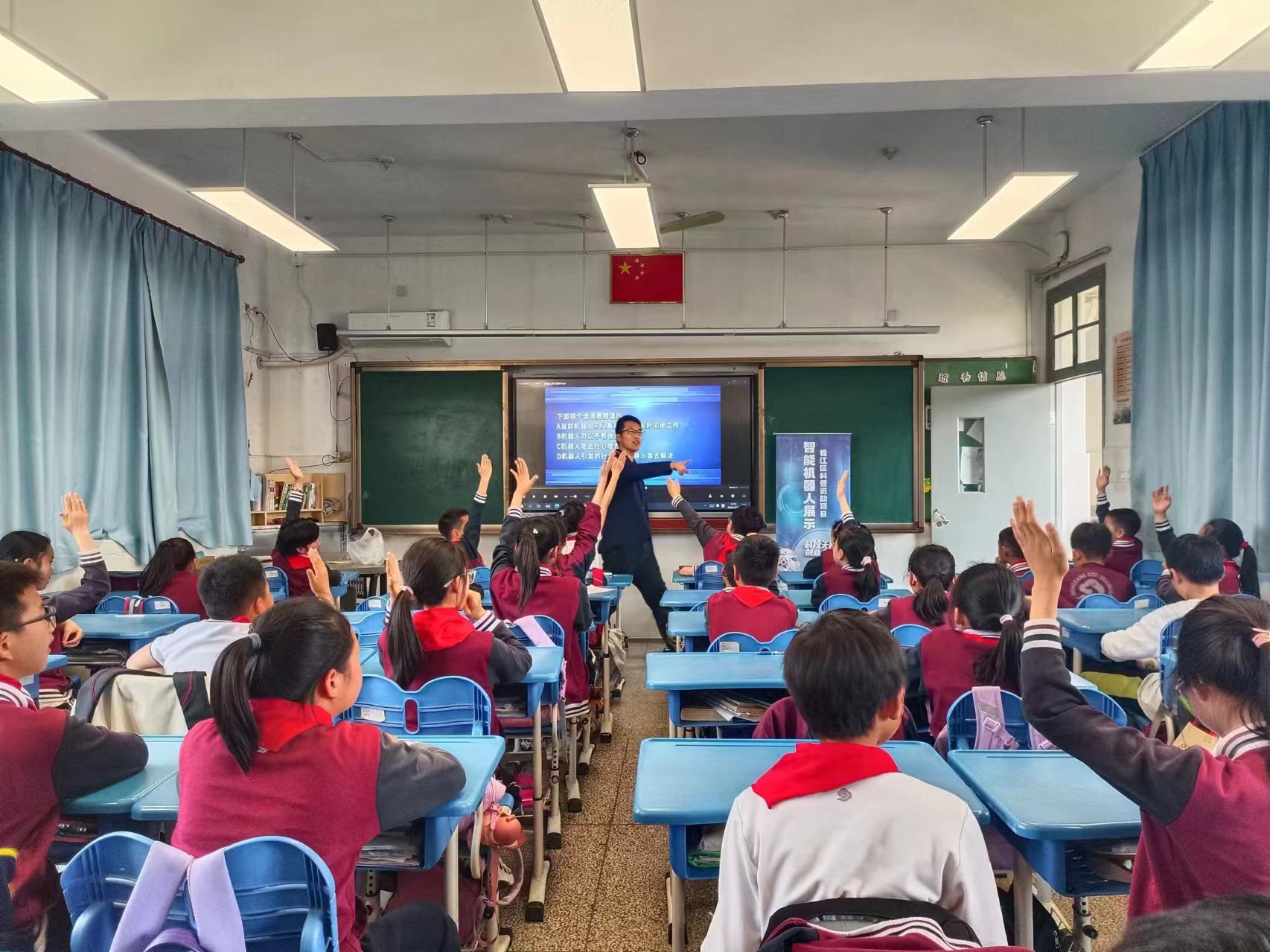 《探究未来生活的伙伴及技术:智能机器人+数字孪生》、《智能机器人展示活动》以及《松江区青少年科技创新体验营》的团队老师与学院团员志愿者来到松江区民乐学校,同一时间为三个五年级班级的同学带来三堂别开生面,各具特色的科普课。在《智能机器人展示活动》的课堂中,主讲毛怀勇老师向同学们介绍了机器人的发展历史、机器人本体的主要构件、核心技术以及主要应用。通过师生互动和现场提问,向学生普及机器人的基本知识。活动中,毛老师还演示了4WD亚博智能小车和智能机器狗两款机器人设备,介绍了设备的主要传感器及电机部件。他指导学生现场操纵设备,对机器人进行无线遥控、亮灯、灭火、行走、语音交互等功能。课堂上不断举起的小手,学生们都迫不及待地想近距离观察机器人内部的构造,争先恐后地亲自体验机器人的操纵方法。