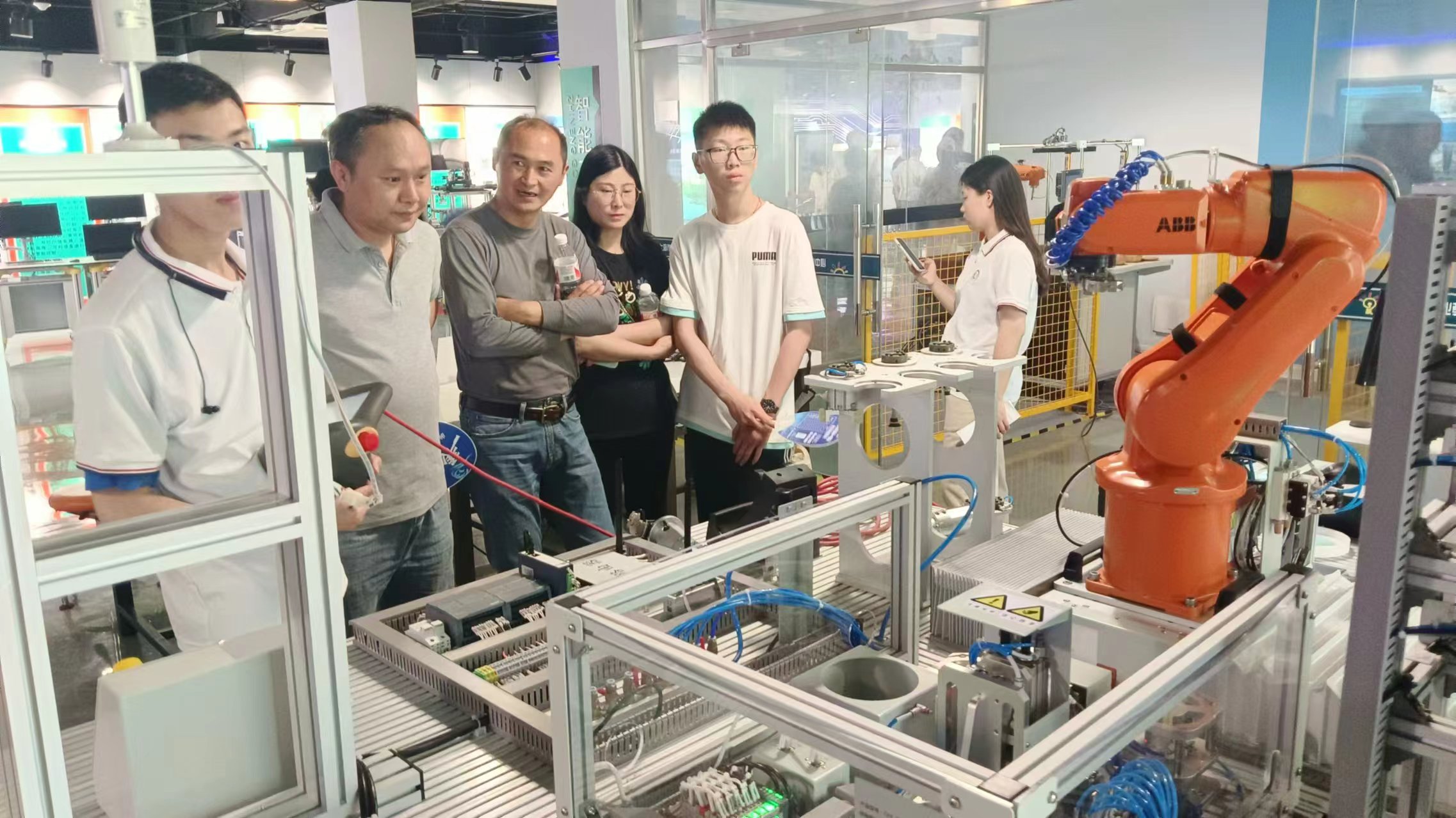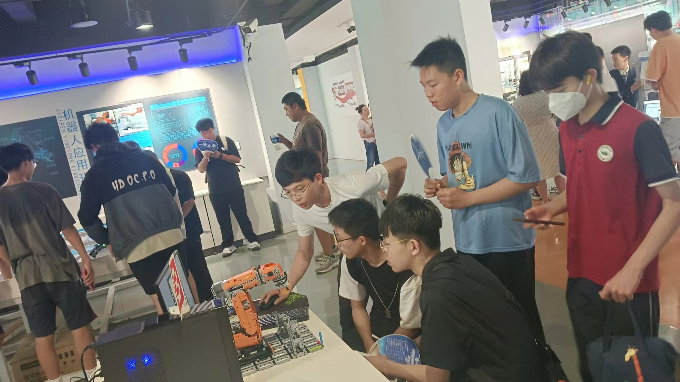 深耕产教融合,科教融汇。智能制造学院格物致知班学子有幸参与了第21届教博会活动,切实感受到科创的力量,落落大方展示了科创出品的人工智能和各类机器人。志愿者们学以致用,随机应变,根据观众的年龄段和兴趣点,现场重新设计程序,完成互动。寓教于乐,孩子们在游戏中很自然的学到了人眼识别、人工视觉和传感器的相关知识。