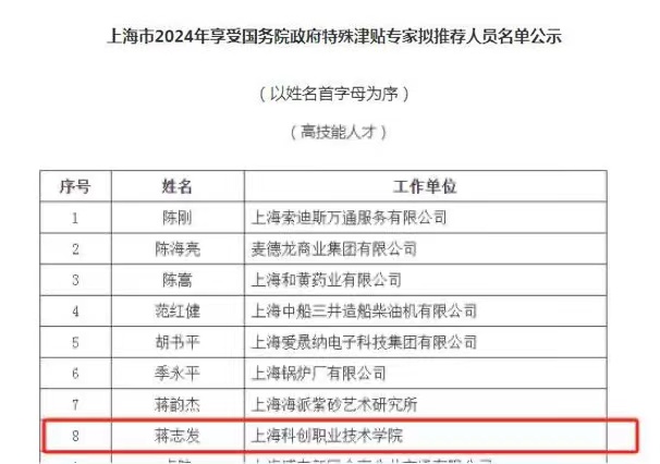 近日,上海市人力资源和社会保障局政务公开网站公示,学院蒋志发老师荣获上海市2024年享受国务院政府特殊津贴专家推荐资格。这不仅是对蒋志发老师多年来辛勤工作的认可,也是对学院技能人才培育成果的高度肯定。