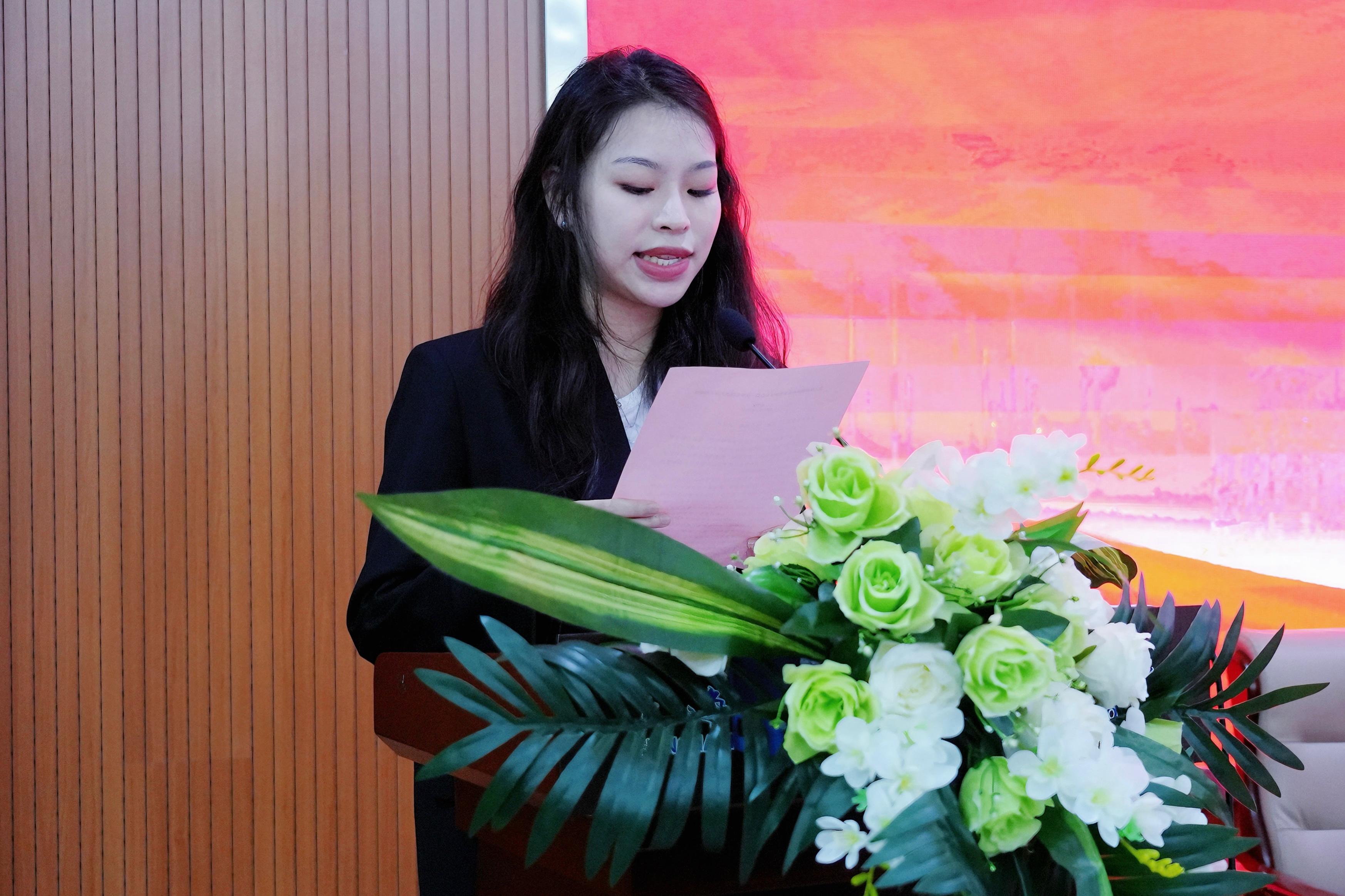 上海音乐学院陈予谦同学代表兄弟单位致辞并向大会的召开表示热烈的祝贺,她认为科创职院的第一次学代会,具有重大的意义,这不仅是一次汇聚青春力量的盛会,更是两校共同书写青春篇章、探索学生工作新境界的起点。笃信前行,弦歌不辍,紧密而务实的合作,是变青年理想为现实的钥匙。展望未来,希望两校学生会共同搭建起高校文化交流的桥梁,共同进步、共同成长。