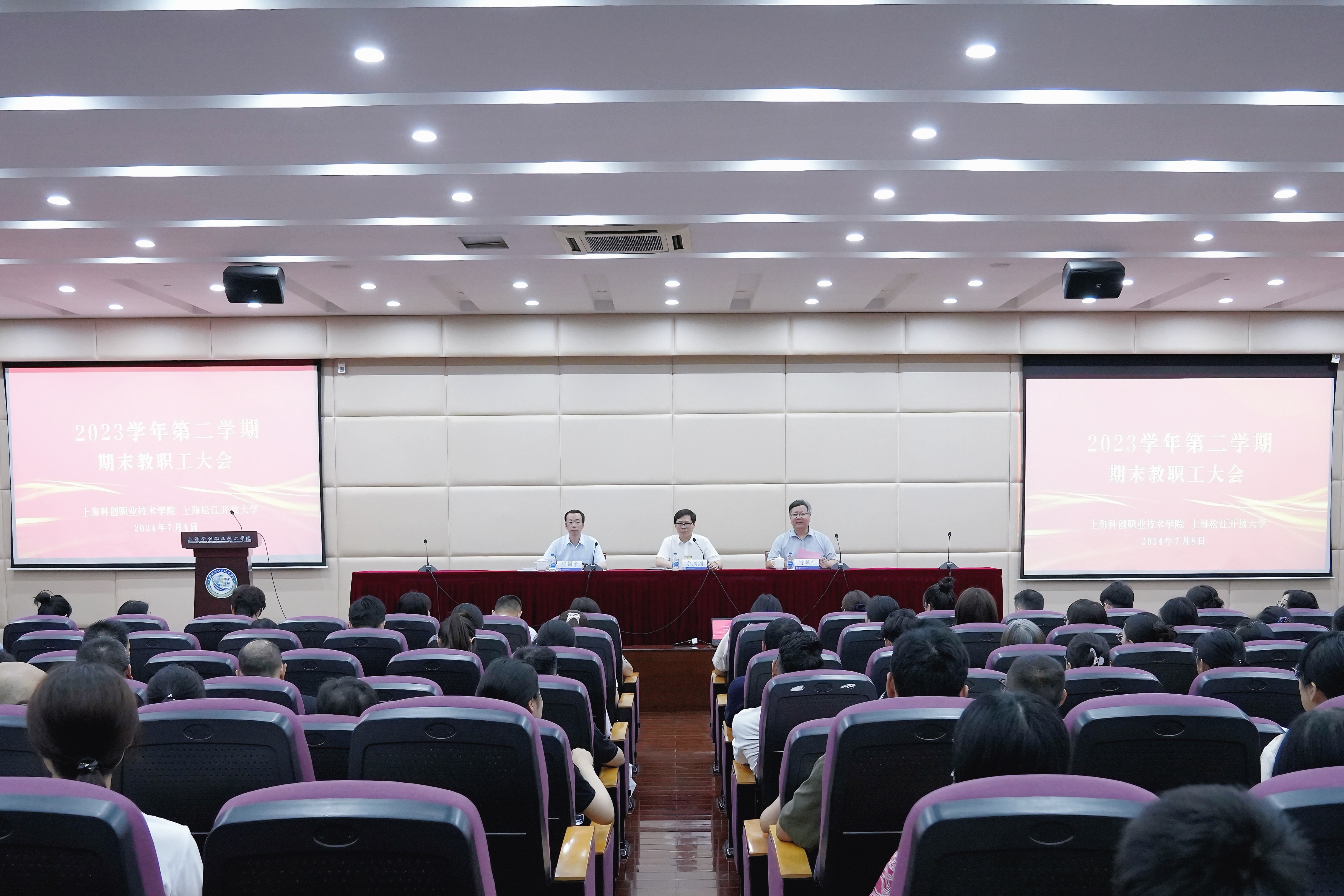 2024年7月8日上午,上海科创职业技术学院、上海松江开放大学召开2023学年第二学期期末教职工大会,党委副书记、院长李闽洲,副院长何佩军、项国平出席,全体教职工参加。会议由李闽洲主持。
