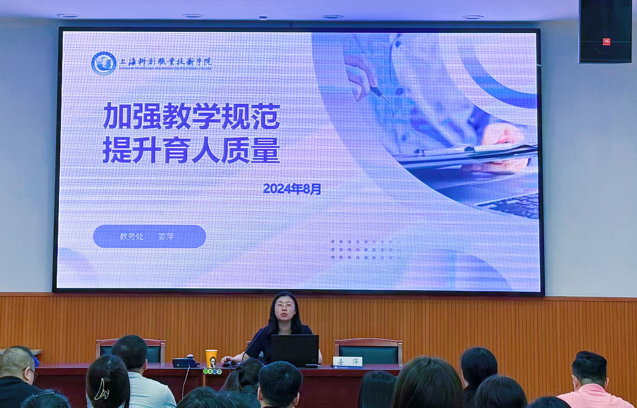 此外,学院还专门设置了实务政策解读和业务能力提升等培训内容,旨在进一步提升新入职教师的教育综合能力。教务处负责人姜萍就学院教学规范与教师发展的相关制度及管理要求进行介绍;松江区国库集中支付教育分中心副主任李蕾围绕学院财务报销纪律与流程等内容进行指导;人事处处长沈红梅对教师绩效认定、考勤考核等人事管理规定进行介绍;科研处负责人谢炎炎就教师成长路径和平台、科研与学术发展以及职称晋升等方面展开介绍。