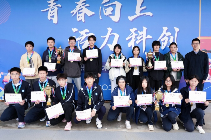 李志伟为“4乘100米接力”前三名的班集体颁奖。