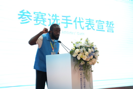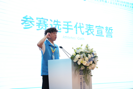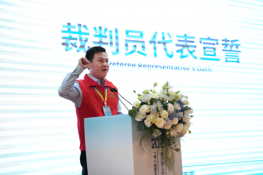 大赛裁判员代表上海闵行职业技术学院董金梁,学生组选手代表上海科创职业技术学院赵铭俊、国际组选手代表纳米比亚Abraham Ndeshipanda Ndeumona Alweendo(艾文东)先后登台庄严宣誓。