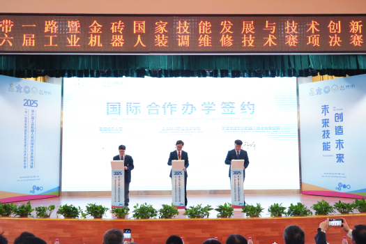 为进一步拓展国际合作的广度与深度,开幕式上还举行了国际合作办学签约仪式。在全场嘉宾的共同见证下,上海科创职业技术学院与泰国格乐大学、天津博诺智创机器人技术有限公司正式签署合作协议,Supat Teeravechcharoenchai、周旺发、李闽洲上台签约。双方将以此次合作为起点,在人才培养、技术创新与交流等领域展开紧密协作,共同推动国际产教融合迈向新台阶。