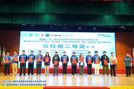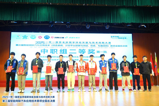 11 月 7日,2025 “一带一路” 暨金砖国家技能发展与技术创新大赛第三届智能网联汽车应用技术全国总决赛在安徽汽车职业技术学院开幕,这场汇聚了全国290 支参赛队伍的顶级赛事,既是各国技能标准互鉴的平台,更是展现中国智能网联汽车技术人才培养成果的窗口。我校智能汽车学院指导教师们带领中职组、高校组共4 支战队从激烈角逐中突围,历经3天激烈的比赛,最终斩获4枚银牌和2枚铜牌,不仅用精准操作诠释了对技术的极致追求,更以青春之姿在“一带一路” 技能合作舞台上,传递着中国智造的创新活力与发展潜力。