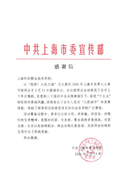 近日,中共上海市委宣传部发来感谢信,对上海科创职业技术学院在2026年上海市各界人士春节团拜会筹备演出中的突出贡献致以诚挚谢意。信中提到,在筹备过程中,学校团队展现了“讲大局、讲奉献、讲担当、讲情怀”的宝贵精神,面对挑战攻坚克难,为团拜会的精彩呈现作出了积极贡献,并指出本次团拜会深情表达了全市人民对“人民城市”的真挚情感,得到了领导同志的高度肯定和社会各界的广泛赞誉。这封感谢信,不仅是对学校四位金牌教师舞台表现的肯定,更是对学校长期以来坚持厚德修身、尚实砺能、弘扬工匠精神的最高褒奖。