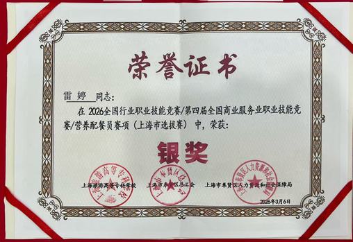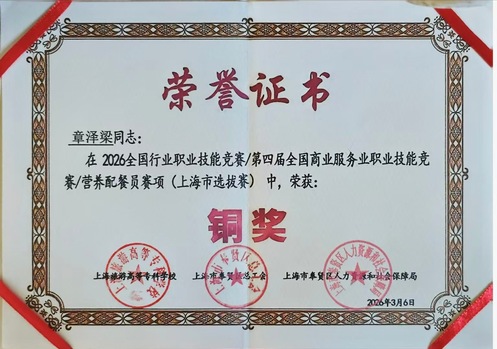 3月6日,第四届全国商业服务业职业技能竞赛“营养配餐员”赛项上海市选拔赛,在国家会展中心(上海)举办的“第六届华食展”期间隆重举行。学校智慧服务学院陈怡帆、雷婷、蔡岷秀和章泽梁四名同学斩获1项特金奖、1项银奖及2项铜奖,青年教师樊震宇荣获职工组金奖,充分展现了科创师生过硬的专业素养与出色的竞技水平。
