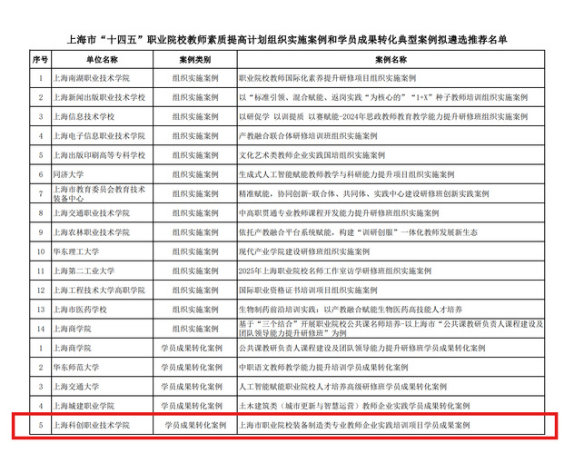 近日,上海市职业教育教师培训管理办公室公示“十四五”职业院校教师素质提高计划典型案例遴选推荐名单,上海科创职业技术学院的《上海市职业院校装备制造类专业教师企业实践培训项目学员成果案例》成功入选,这是学校推进国培项目、深化产教融合、加强“双师型”教师队伍建设的重要成果。