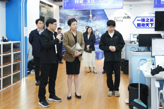 调研期间,陈容一行还实地参观了学校世赛基地和实训中心,详细了解了实训设施设备、课程设置以及技能人才培养模式等情况。