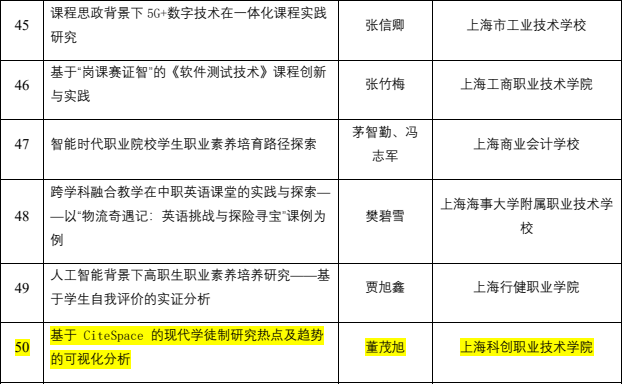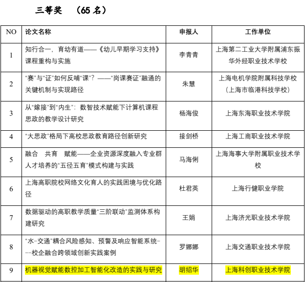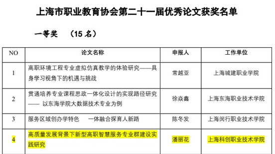 其中,潘丽花老师的论文《高质量发展背景下新型高职智慧服务专业群建设实践研究》凭借其深入的研究与独到的见解,荣获一等奖;陈三梅老师的论文《高职院校产教深度融合机制与路径研究—基于上海科创职业技术学院的实践》和姜萍老师的论文《职业技能大赛赋能高职教学质量提升的内在逻辑、实践困境与路径探索》则以其实践性和创新性,双双获得二等奖;胡绍华老师的论文《机器视觉赋能数控加工智能化改造的实践与研究》和董茂旭老师的论文《基于 CiteSpace 的现代学徒制研究热点及趋势的可视化分析》也凭借其独特的视角和深入的分析,分别获得三等奖;此外,王珊老师的课题《立德树人视域下高职院校美育课程的开发与实施路径研究》以其前瞻性的研究视角和切实可行的实施路径,荣获优秀项目奖。