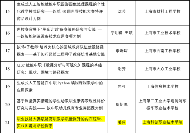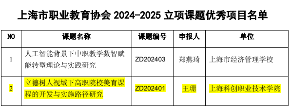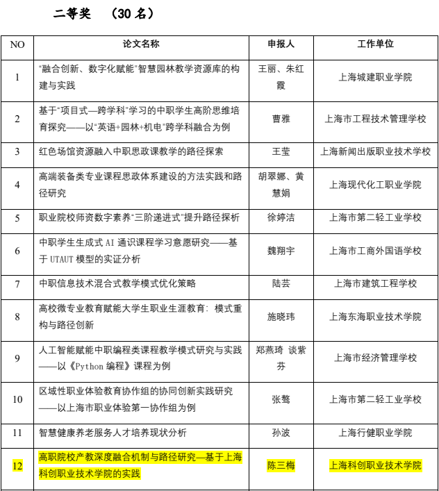 近日,上海市职业教育协会积极响应国家关于深化现代职业教育体系建设的号召,紧密结合上海市职业教育改革发展的实际情况,精心组织了第二十一届优秀论文评选活动及2024-2025年度课题结项评审工作。在学校科研处的积极组织与大力推动下,我校教师踊跃参与此次评选与评审活动,展现了深厚的学术底蕴和强烈的教育情怀。经过专家团队的严格评审与筛选,我校共有6位教师的论文和课题脱颖而出,荣获佳绩。