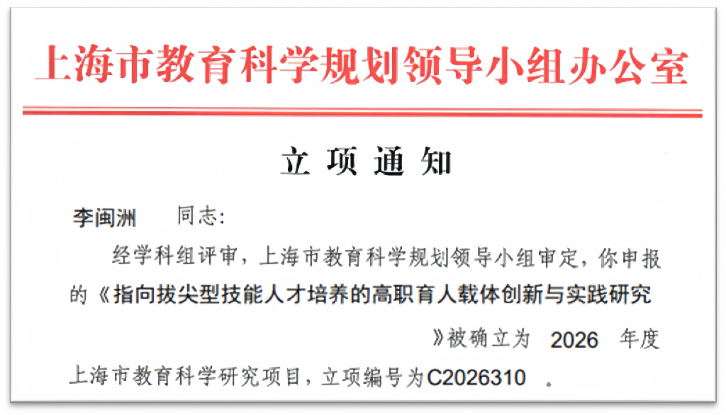 根据《上海市教育委员会关于公布2026年度上海市教育科学研究项目等市级科研项目立项名单的通知》,李闽洲院长申报的《指向拔尖型技能人才培养的高职育人载体创新与实践研究》获批立项为市级教育科学研究一般项目。