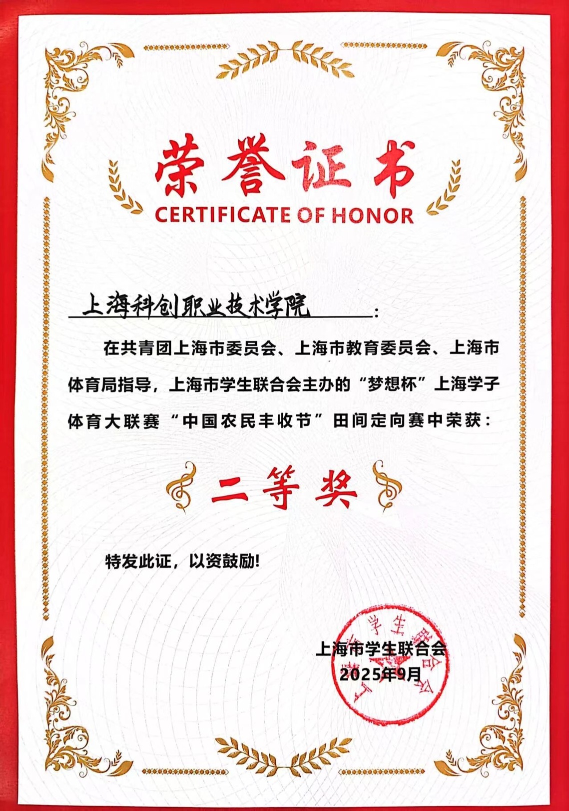9月20日,上海市“梦想杯”体育大联赛中国农民丰收节田间定向赛落幕,此项赛事由上海市团市委、市学联主办,40支高校代表队参与赛事,科创职院派出12名学生组队参赛,斩获二等奖,学校荣获优秀组织奖。