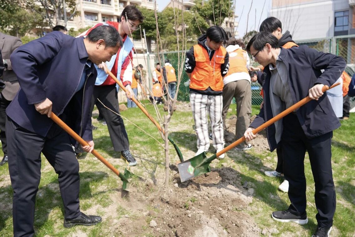 校领导与同学们并肩劳作,挖坑、扶苗、培土、浇水,“劳动光荣、绿色发展”的价值观念在谈笑间自然传递。现场分工明确、配合默契,工作人员穿梭其间巡回指导,确保每一棵树苗都栽得规范、种得安心。短短半小时,几十株树苗便在春风中稳稳立起。