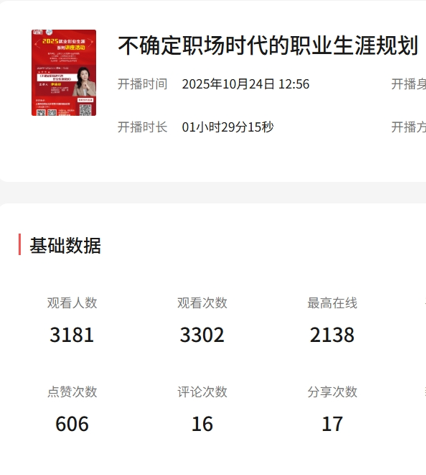 2025年10月24日下午,由上海市人力资源和社会保障局指导,上海市就业促进中心主办,上海科创职业技术学院协办的“2025就业创业生涯系列讲座”直播活动在我院成功举行。本次讲座特邀上海开放大学公共管理学院副院长、国家一级企业培训师伊晓婷,为现场300余名师生带来题为《不确定职场时代的职业生涯规划》的精彩分享,在线观看人员达3200人次。