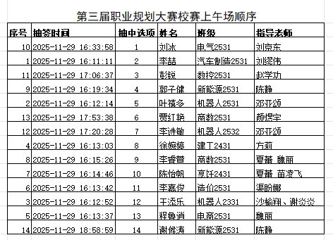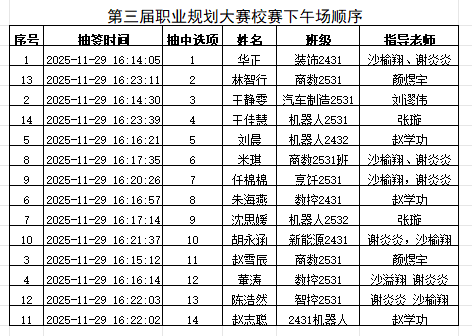 为充分调动学生参赛热情,本次校赛分为三个阶段推进:11月5日至25日为动员培训与报名阶段;11月26日至30日为校赛初选,由14名指导老师遴选产生28名种子选手晋级校级复赛;12月2日至3日举行校级决赛,邀请3名校外专家对选手材料进行评审并组织现场答辩。答辩分上、下午两场进行,选手们围绕职业目标、成长路径与实践计划展开阐述,专家则从职业定位、可行性、创新性等维度进行综合评分。
