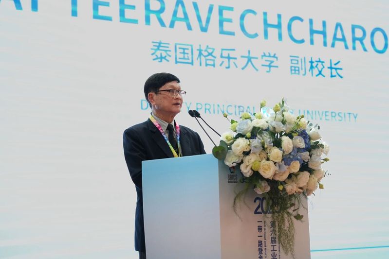 Supat Teeravechcharoenchai首先对主办方、联合主办方以及承办和联合承办单位的辛勤付出表示感谢。他表示,“一带一路”倡议和金砖国家合作机制正推动着全球经济和技术飞速发展,而技能是联结各国、实现共同发展的“金钥匙”。他表示,格乐大学将继续推动区域教育合作与人文交流,培养具有国际视野、掌握前沿技术的复合型人才,促进中泰两国乃至“一带一路”沿线国家在职业教育、技术创新和人才培养等方面深度融合。