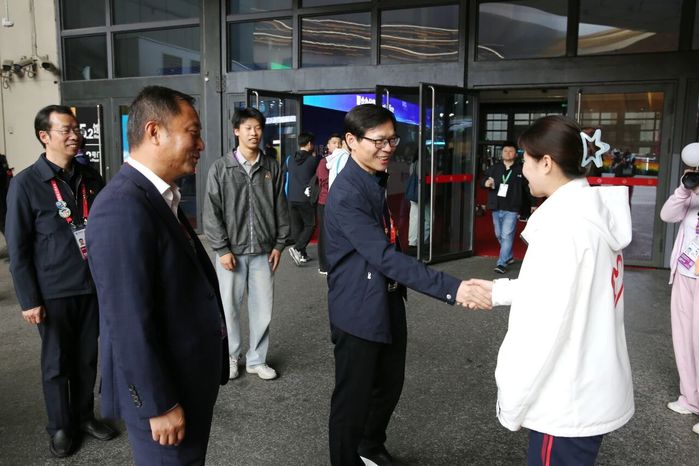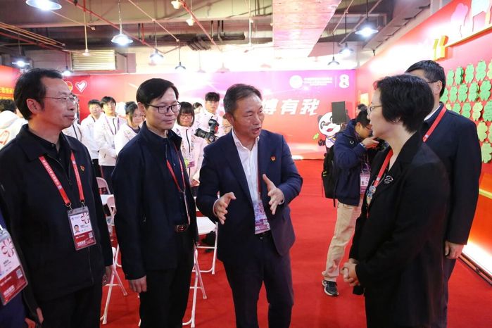 微党课结束后,学院党委书记何锋,党委副书记、校长李闽洲,副校长项国平继续深入场馆,实地走访了各个志愿者岗位,了解同学们的工作情况,送上关心与慰问,鼓励他们以饱满的热情和专业的服务完成光荣使命。