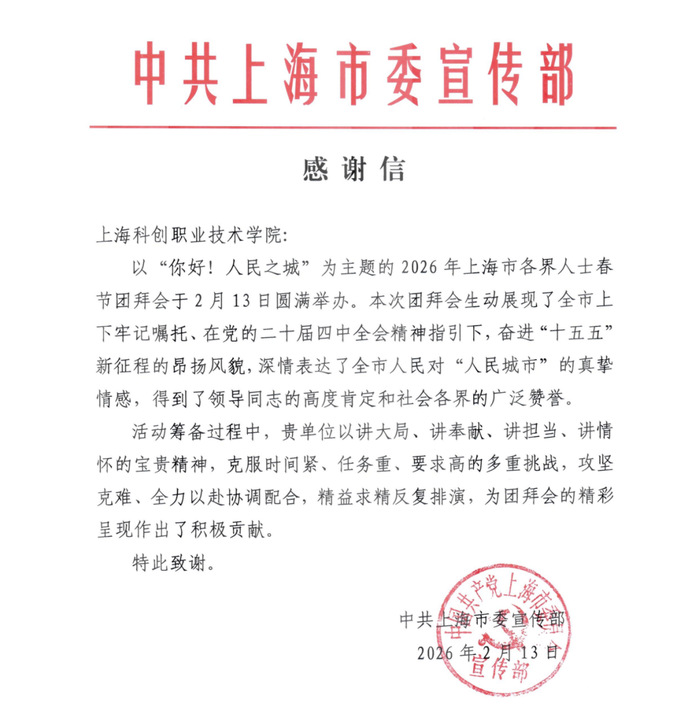 近日,中共上海市委宣传部发来感谢信,对上海科创职业技术学院在2026年上海市各界人士春节团拜会筹备演出中的突出贡献致以诚挚谢意。信中提到,在筹备过程中,学校团队展现了“讲大局、讲奉献、讲担当、讲情怀”的宝贵精神,面对挑战攻坚克难,为团拜会的精彩呈现作出了积极贡献,并指出本次团拜会深情表达了全市人民对“人民城市”的真挚情感,得到了领导同志的高度肯定和社会各界的广泛赞誉。这封感谢信,不仅是对学校四位金牌教师舞台表现的肯定,更是对学校长期以来坚持厚德修身、尚实砺能、弘扬工匠精神的最高褒奖。