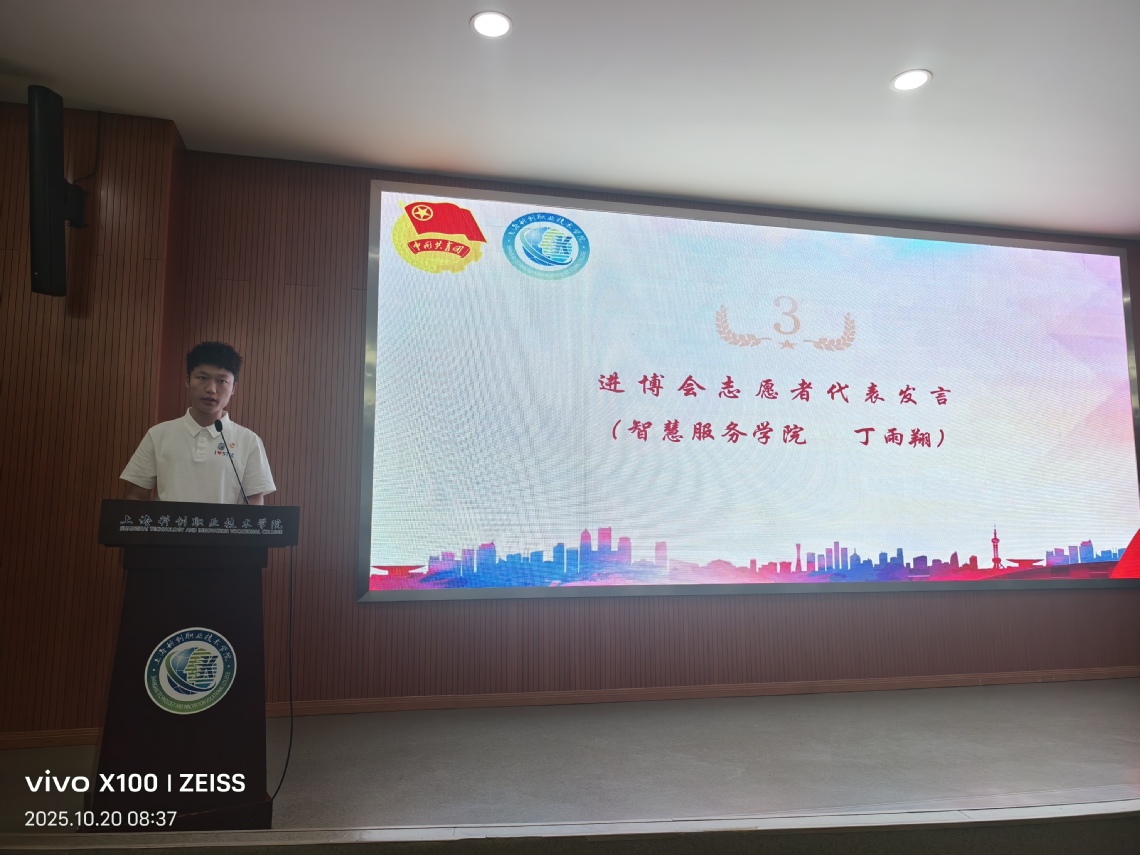 今天,当“进博会志愿者”的身份落在肩上,我又多了一份沉甸甸的使命。这是学校第一次参与进博会志愿服务,我深知这份“第一次”来之不易,是开疆扩土的使命,我深知“第一批小叶子”责任重大,是学校的信任,更是我们与时代同行的契机。进博会是文明交流、理念互鉴的璀璨舞台,是世界看中国的窗口,而我们,将成为这扇窗口前鲜活的青春名片。我们将牢记“厚德修身,尚实励能”的科创校训,充分发挥严谨务实、精益求精的“工匠精神”和“冠军精神”,我们来自不同的专业领域,拥有各具特色的技能,我们都怀揣着同一份热忱,我们将以最坚定的姿态、最昂扬的斗志、最扎实的行动,为进博会的顺利开展保驾护航,向全世界展示中国青年的自信、开放与担当。