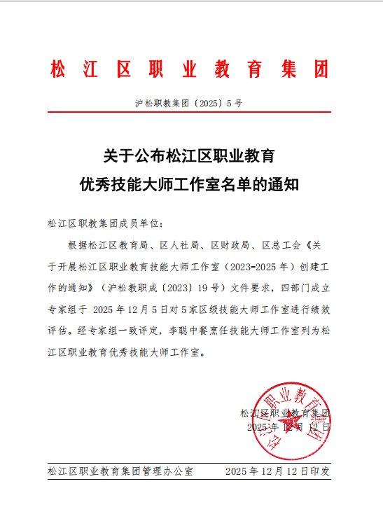 近日,松江区职业教育集团正式公布2023—2025年度区级职业教育优秀技能大师工作室名单。由上海科创职业技术学院与松江区餐饮协会共同建设的“李聪中餐烹饪技能大师工作室”经过严格评审,成功获评“优秀技能大师工作室”。