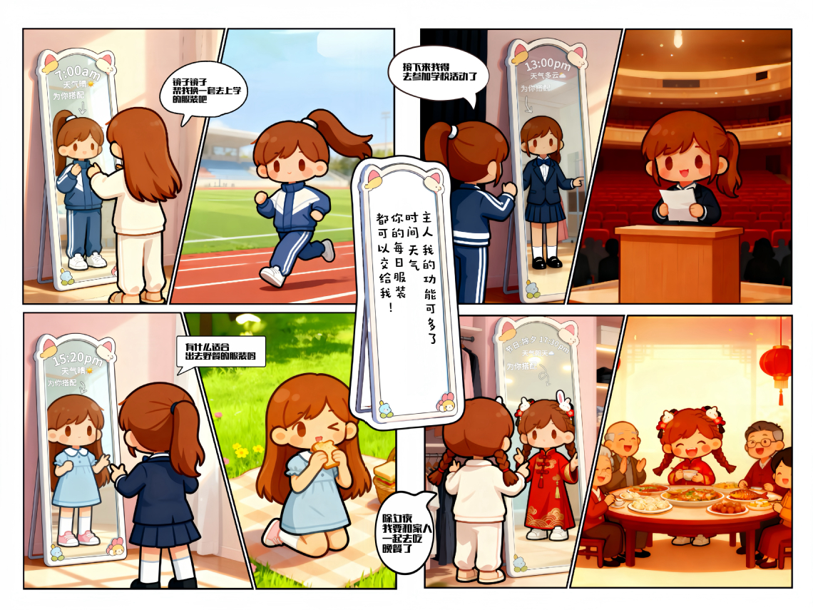 电商2452的作品题为《我的穿搭“镜”负责》,共有四幅插画构成。聚焦在校生如何充分利用现有的衣服,在这面高科技加持的镜子面前,根据天气和出席的场合进行搭配,做到事半功倍的效果。四幅插画涵盖在校生活、登台演讲、踏青郊游以及新春拜年。设想贴近生活所需,故深受师生们的共鸣和喜欢。