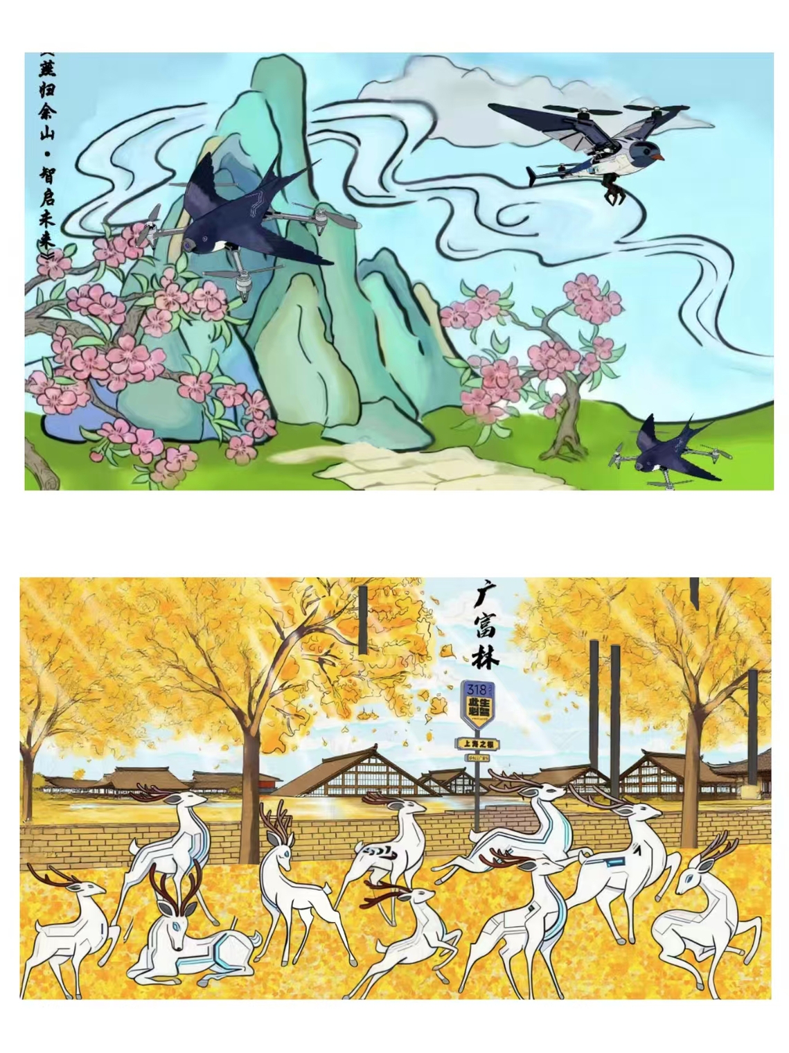 电商2451班的作品题为《智燕织梦 机鹿余鸣》,共有两幅作品组合而成。第一幅作品以历史人文与自然景观交融的上海佘山为背景,巧妙地将象征春天与吉祥的“燕子”与代表前沿科技的“机器人”意象合二为一。画作中,一群流线型、充满未来感的燕型机器人翩然飞越佘山之巅,与月湖的波光粼粼相映成趣,构成了一幅科技与自然和谐共生的诗意画卷。第二幅作品深入挖掘上海之根——广富林文化的深厚底蕴,对标志性文化符号“十鹿九回头”进行了大胆的当代重构。画作中,广富林文化遗址的古典建筑与水光倒影依旧,而那十只回头的鹿,其肌体与纹路由精密的机械结构与仿生机器人构件构成,在古朴的背景下闪烁着科技的金属光泽,形成了一种跨越时空的对话。