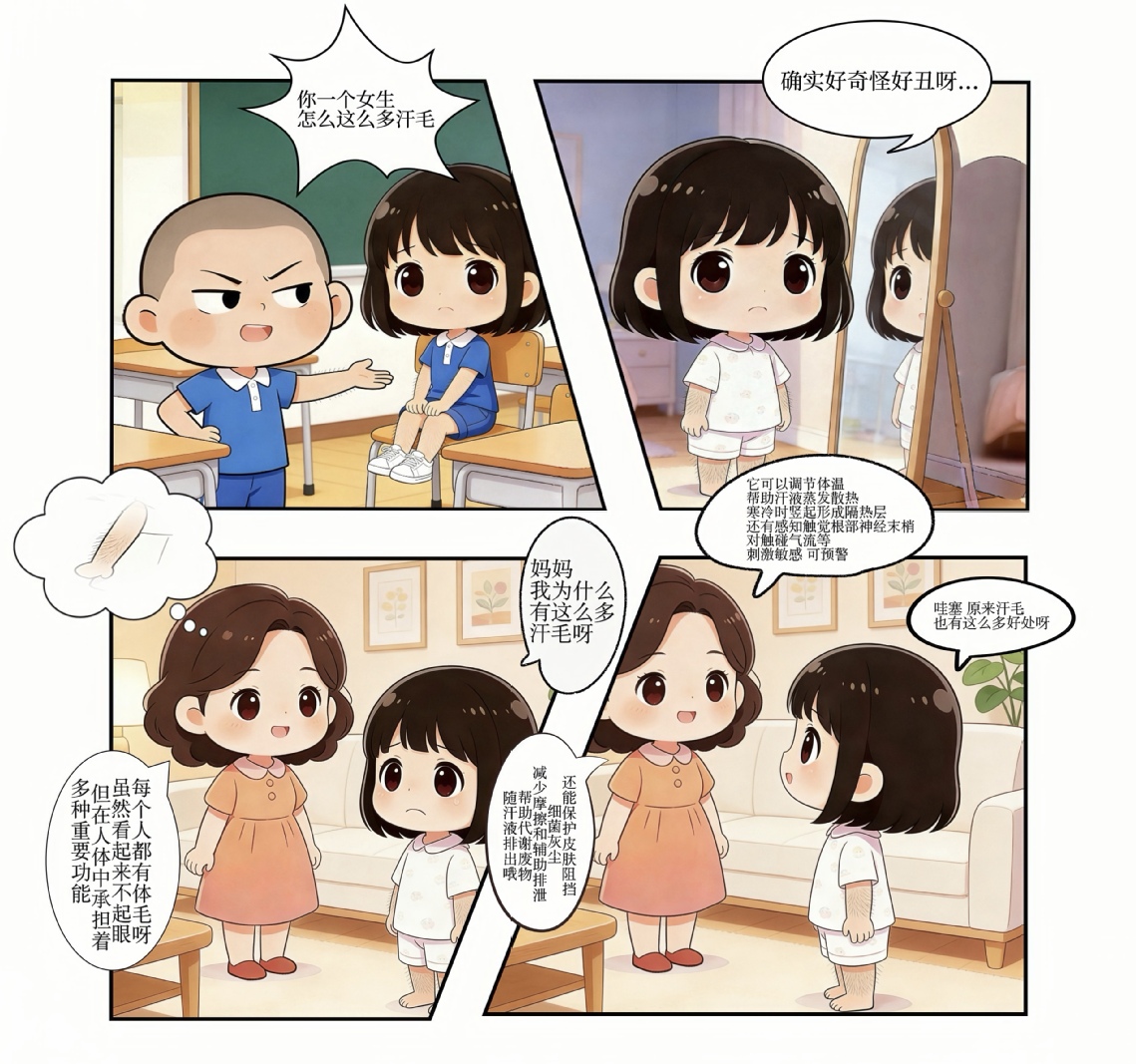 由杨奕昀、邹洁妮创作的《藏在体毛里的小秘密》,通过女孩在母亲引导下接纳身体变化的温情故事,引导青少年科学认识自我,体现了全员育人中家庭与学校协同关怀、全过程助力认知觉醒的育人深度。