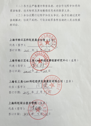 为深入贯彻党的二十届三中全会关于“深化产教融合、校企合作”的重要精神,落实《国家职业教育改革实施方案》及上海市职业教育产教融合相关政策,充分发挥松江区作为长三角G60科创走廊核心区域的产业与教育资源优势,构建“政府引导、研究驱动、企业主体、学校育人”的产教融合协同创新机制,上海市松江区科创发展办公室(以下简称“区科创办”)、上海市松江区长三角G60科创走廊创新研究中心(以下简称“区G60创新研究中心”)、上海长三角G60科创经济发展集团有限公司(以下简称“G60科创集团”)、上海科创职业技术学院(以下简称“科创学院”)经友好协商,就共建松江“科创联盟”达成如下战略合作框架协议,以构建四方联动,打造“政研企校”四位一体的产教融合创新生态体系。协议签订时间:2025年5月23日