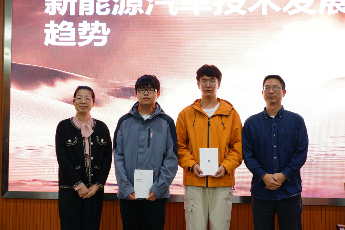 讲座伊始,钱老师将一本印有蔚来公司logo的收藏证书赠与一位学生,嘉奖他对本次讲座的积极性,并向大家表明他将会把剩下的一本赠与另一位积极的同学,这极大地激发了学生的积极性,使得讲座更富活力。