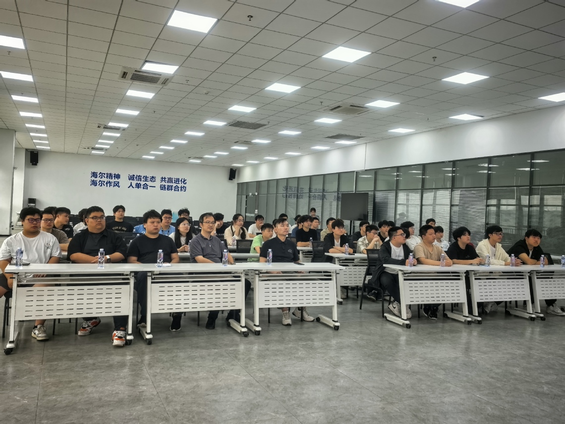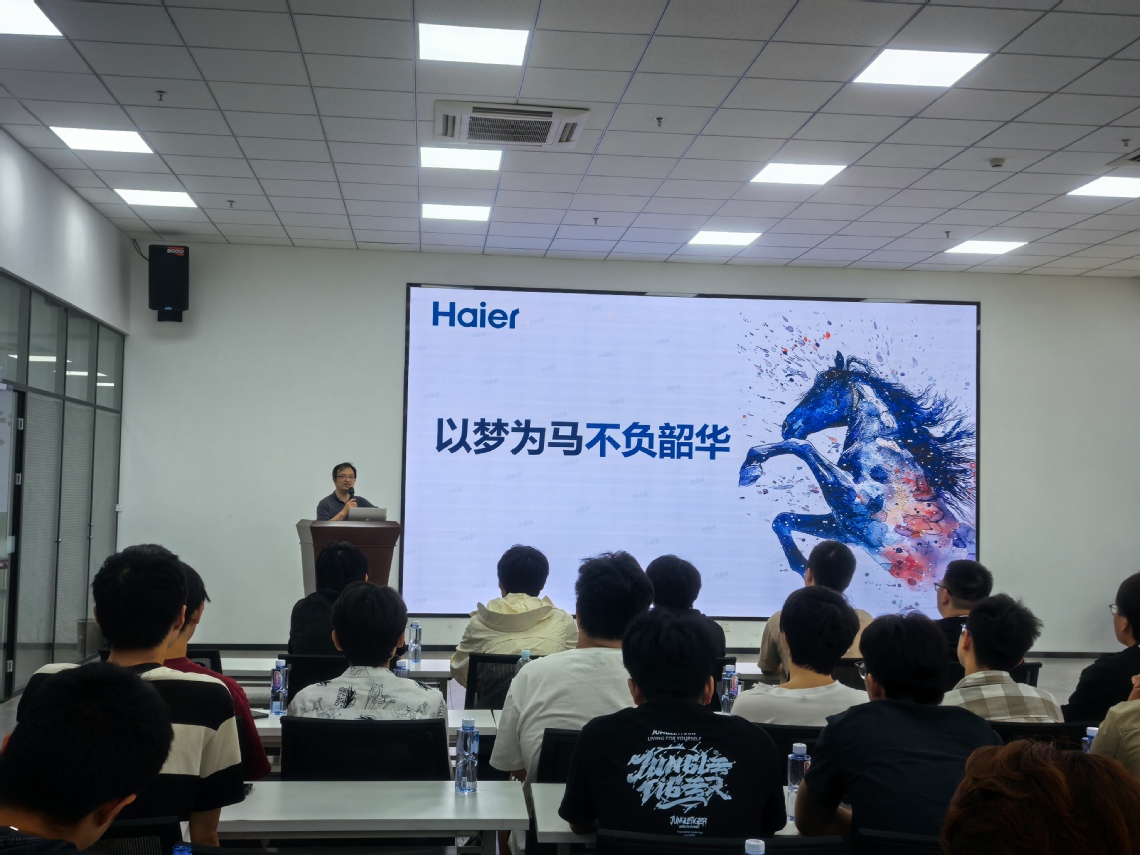 中午时分,师生们在海尔员工食堂体验企业工作餐,切身感受海尔的企业文化氛围。餐后,海尔洗衣机工厂人事经理陈鑫鑫为师生们带来专题宣讲,详细解读了海尔在智能制造领域的发展战略和人才需求标准。他特别介绍了海尔特色的"雏鹰计划"培养体系:"我们不仅看重专业技能,更注重学习能力和创新思维。通过轮岗实践、导师带教等专项培训,助力学生快速成长。"