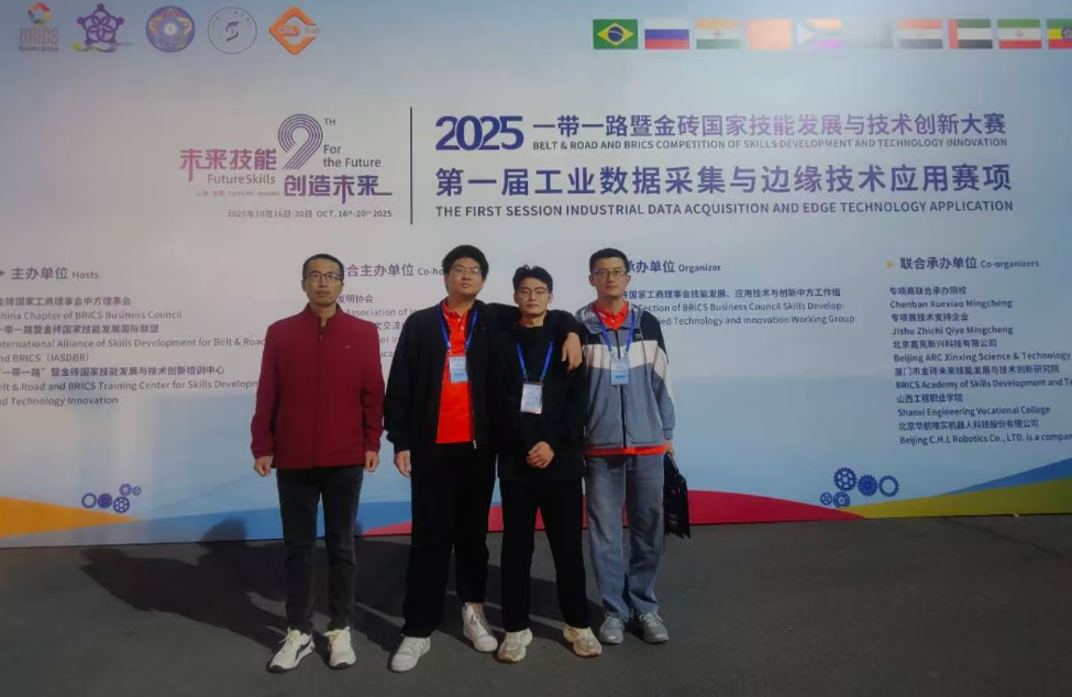 2025 10 18-19,山西工程学院内赛事氛围浓厚。我校胡向阳、毛怀勇两位教师带领刘诗桐、唐云飞两名学生,在此参加2025 一带一路暨金砖国家技能发展与技术创新大赛第一届工业数据采集与边缘技术应用赛项。经过 3 个小时的激烈角逐,师生团队凭借扎实的专业能力和默契的协作,最终荣获教师组二等奖与学生组二等奖,为学校赢得荣誉。