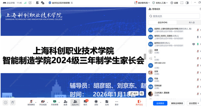 1月18日上午,智能制造学院召开全体学生家长与全体班主任老师相聚云端,召开线上家长会,会议由刘京东老师主持。刘京东对各位家长的参与表示诚挚欢迎,并简要介绍了会议流程。随后,赵学功老师就学校整体概况、班级建设现状以及学校学生管理规定等方面,向家长作了系统、清晰的解读;通过详实的数据与实例,赵老师展示了学院的教学管理特色与学生成长支持体系,帮助家长进一步了解学生在校的学习与生活环境。
