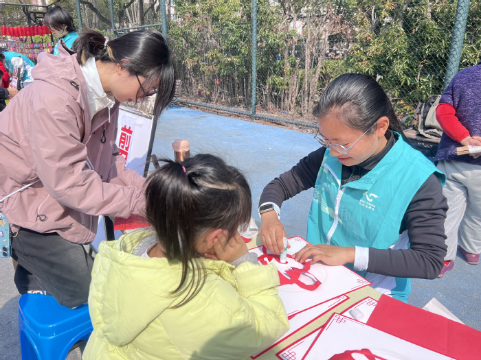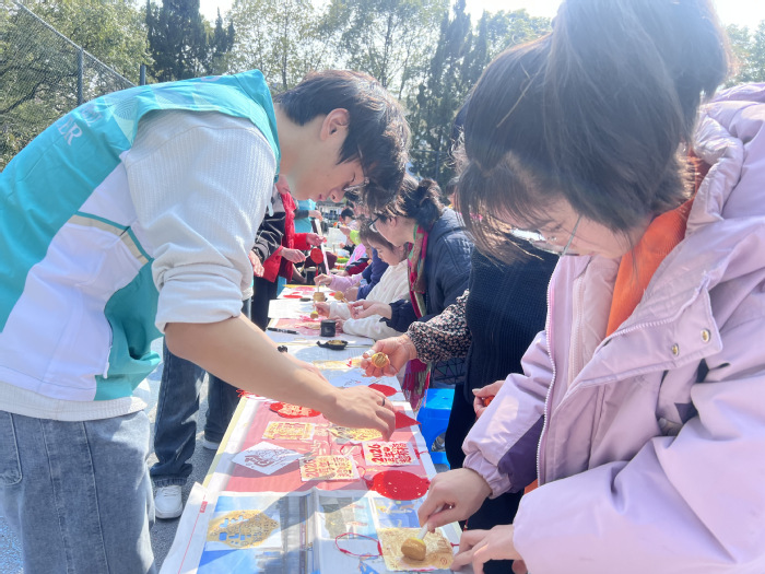“扭扭棒·柿柿如意”摊位前排起长队,机器人2532班李诗敏和互联网2451班何丁杰手把手教孩子们制作小柿子,传递“柿柿如意”的美好寓意。福字拓印志愿者、机器人2431班顾俊颢提前一小时到岗,协助布置工具、调试墨辊,他说:“能用自己的服务让社区居民感受传统年味,特别有意义。”